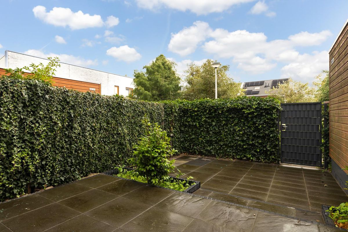 De achtertuin van circa 30 m2 is zonnige gelegen op het zuidoosten met achterom, buitenkraan en een houten berging (met elektra).