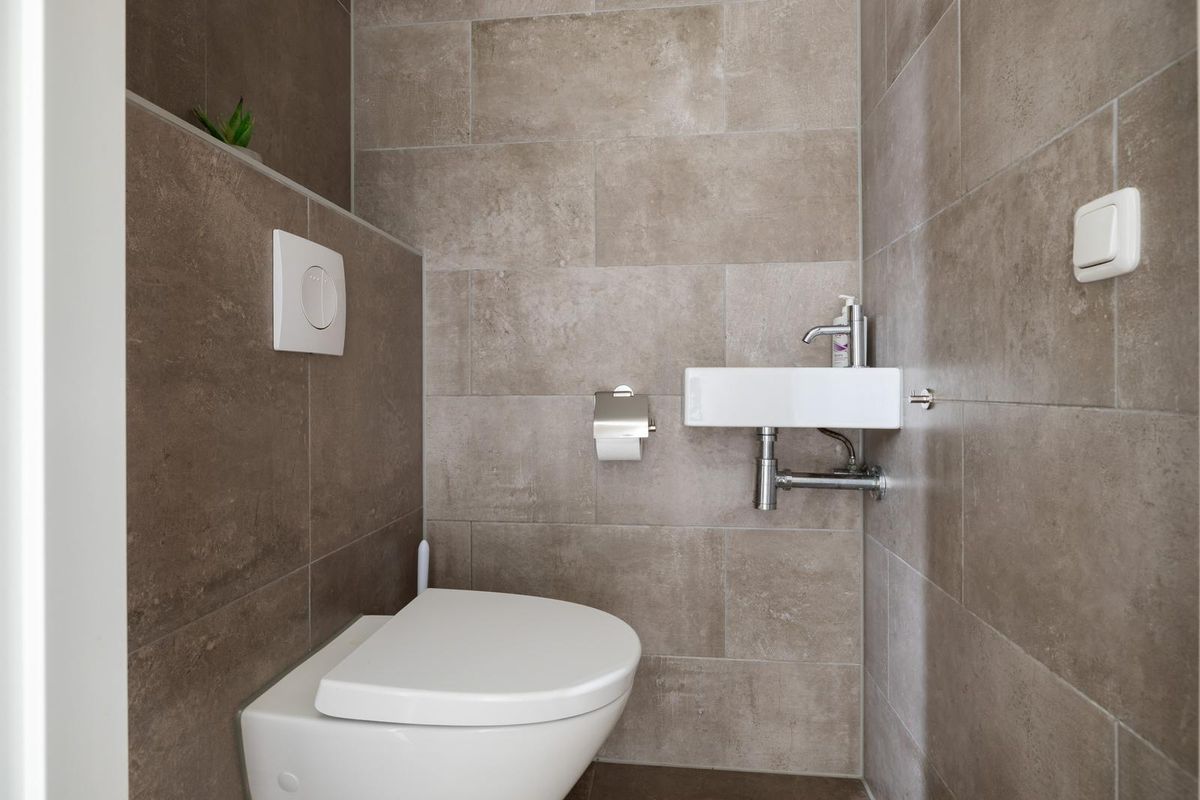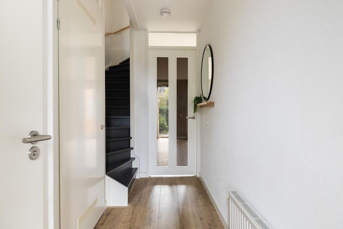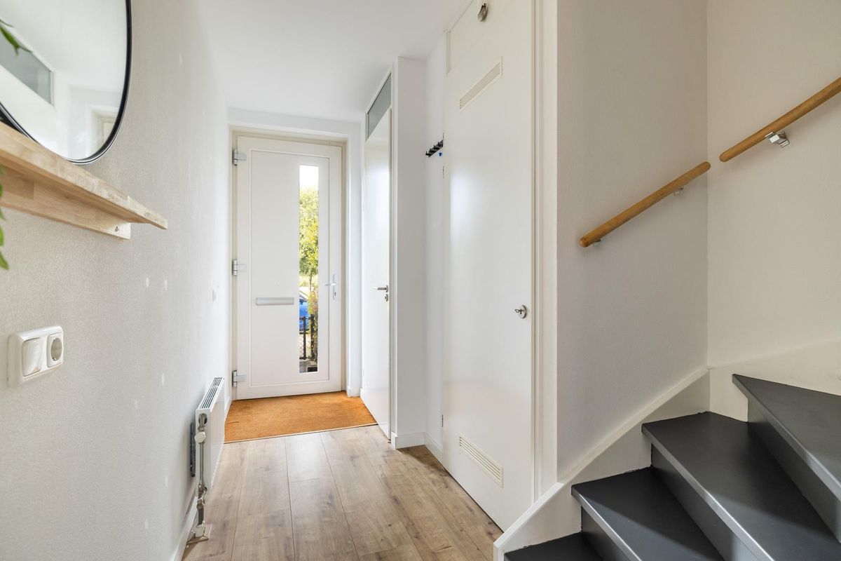 De voortuin is verzorgd en onderhoudsvriendelijk ingericht met buitenkraan. Bij binnenkomst in de hal treft u toilet met fonteintje, meterkast, trap naar de eerste verdieping en een deur naar de woonkamer.