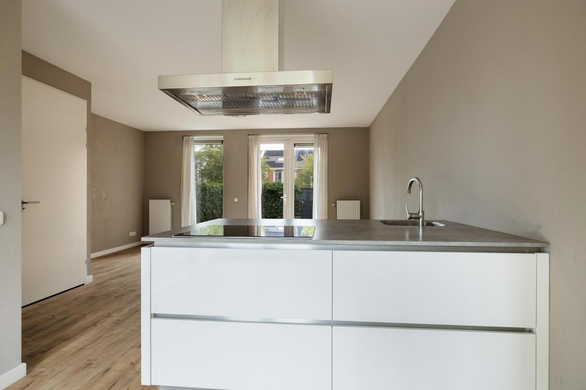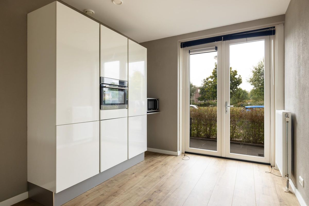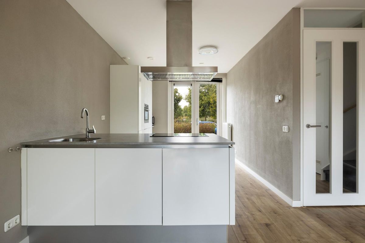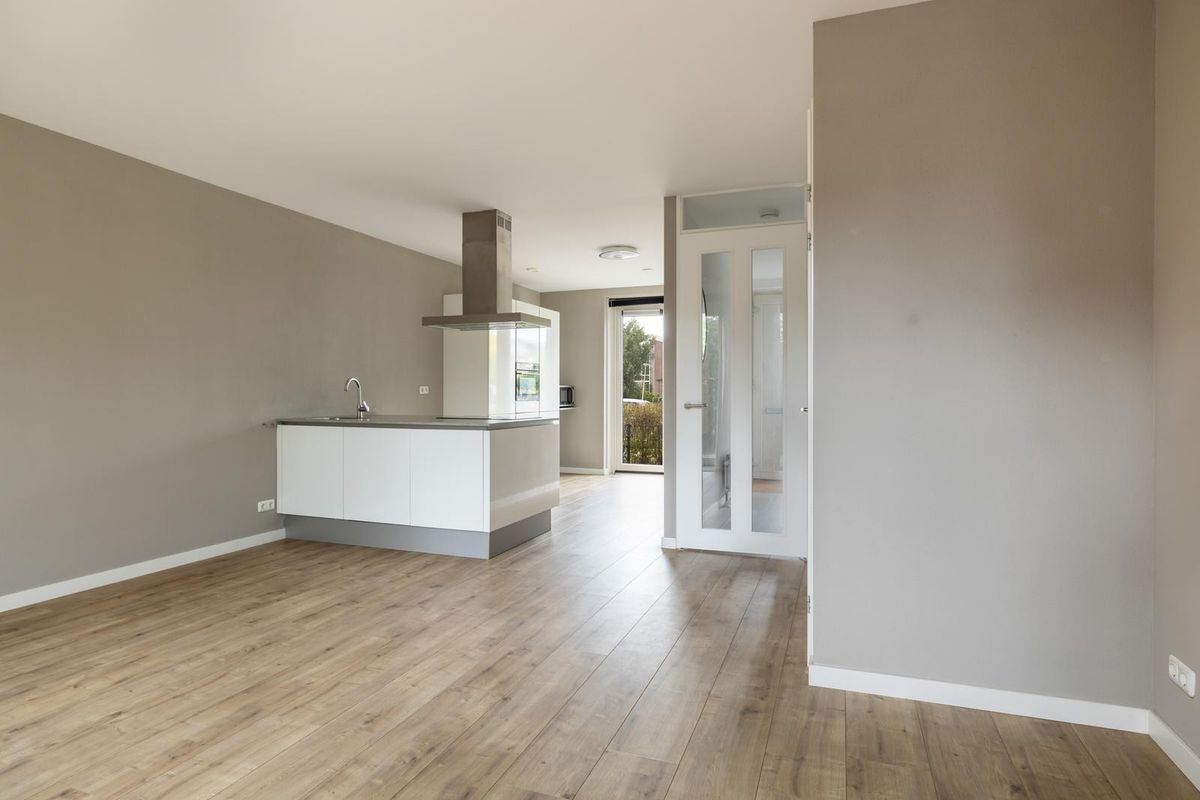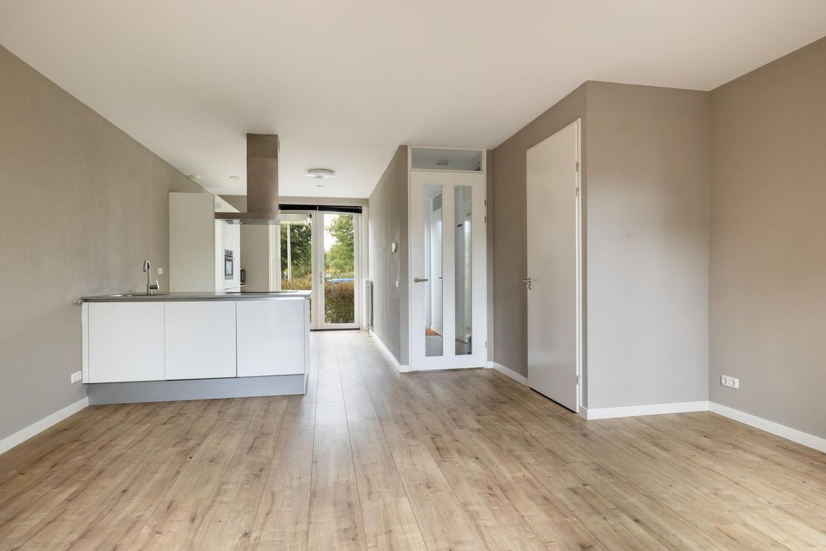 Een heerlijke lichte living dat aan de voor- en achterzijde open gezet kan worden met de openslaande deuren. Op de vloer is een kwalitatieve laminaatvloer gelegd en zijn de wanden en plafonds strak afgewerkt.
