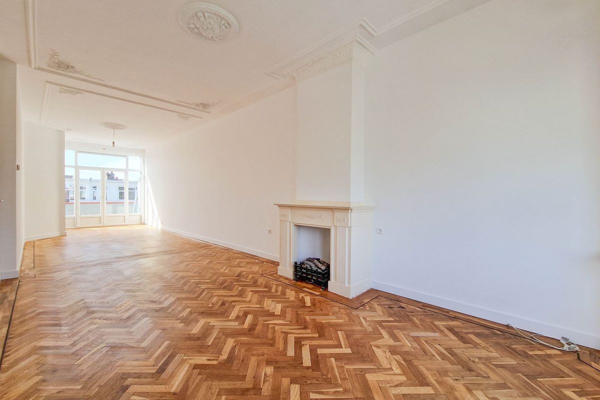 ruime doorgebroken woon-eetkamer voorzien van visgraat parket vloer, sierschouw voor en openslaande deuren naar het balkon op de middag- en avondzon.