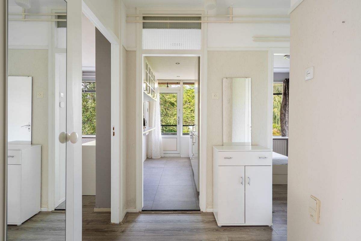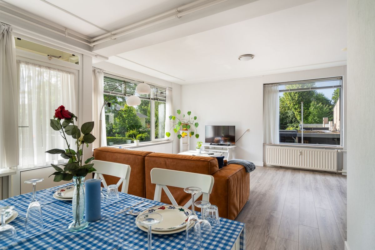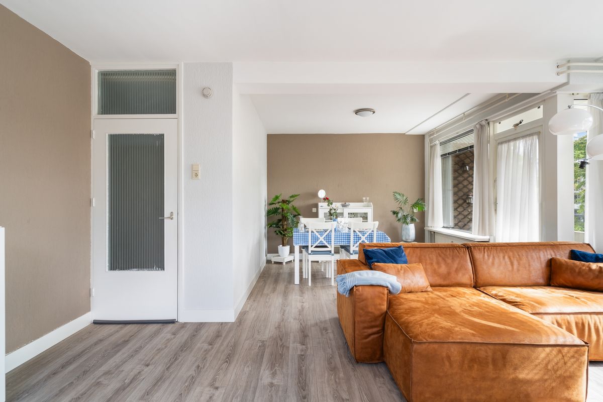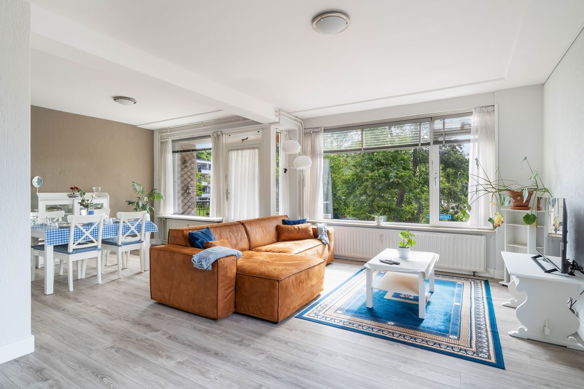 De woonkamer is licht en royaal, met voldoende ruimte voor een zit- en eethoek. Grote ramen zorgen voor veel natuurlijk daglicht, waardoor de ruimte extra uitnodigend aanvoelt. Aansluitend ligt de eetkamer, die toegang biedt tot het balkon aan de achterzijde. Hier kun je rustig buiten zitten met uitzicht op de groene omgeving en genieten van de zon.
