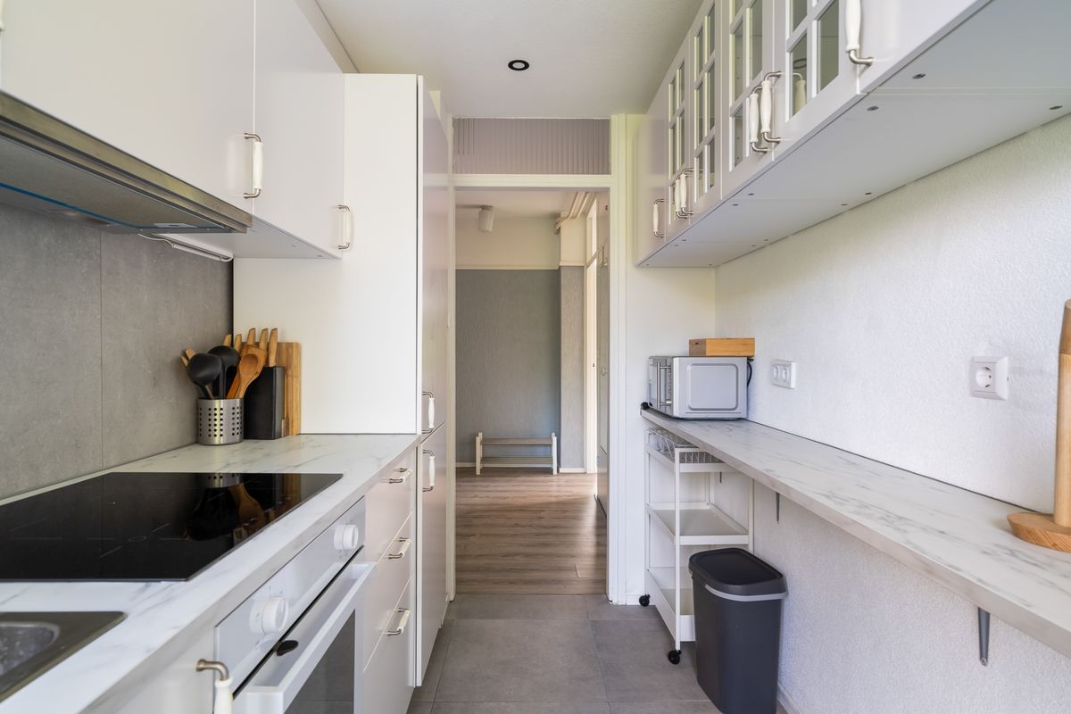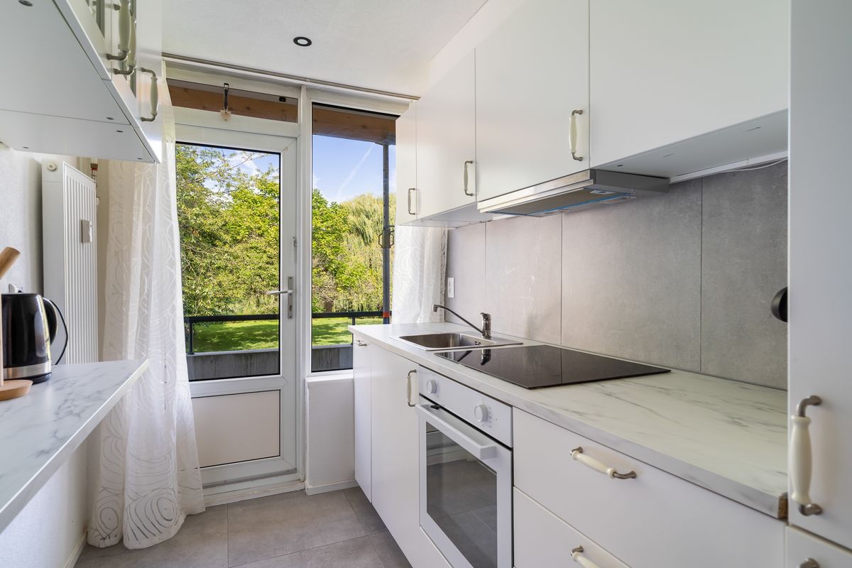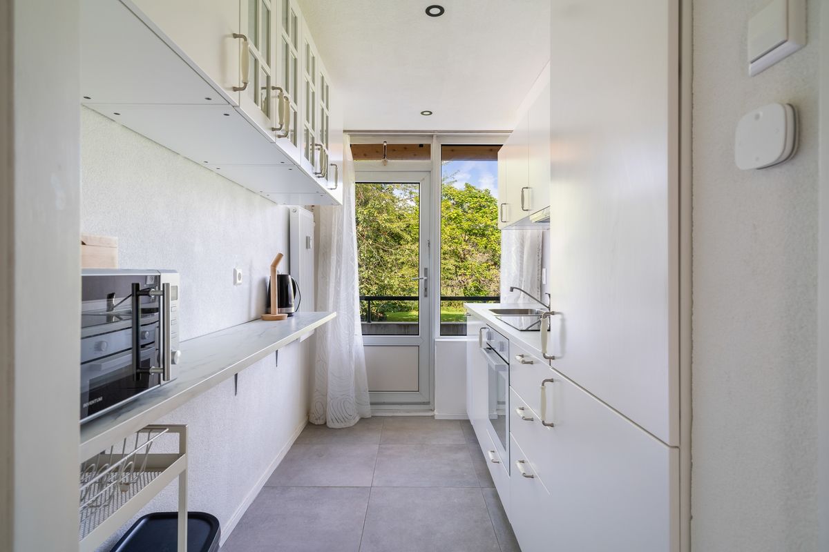 Aan de voorzijde van de woning bevindt zich de gesloten keuken, die eveneens toegang heeft tot een tweede balkon. De keuken is praktisch ingedeeld en biedt voldoende werk- en kastruimte.