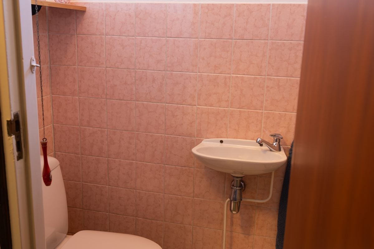 Via de hal heeft u toegang tot de toiletruimte met een staand toilet en fonteintje, de meterkast met voldoende moderne groepen, en de provisiekelder waarvan de vloer geheel betegeld is.