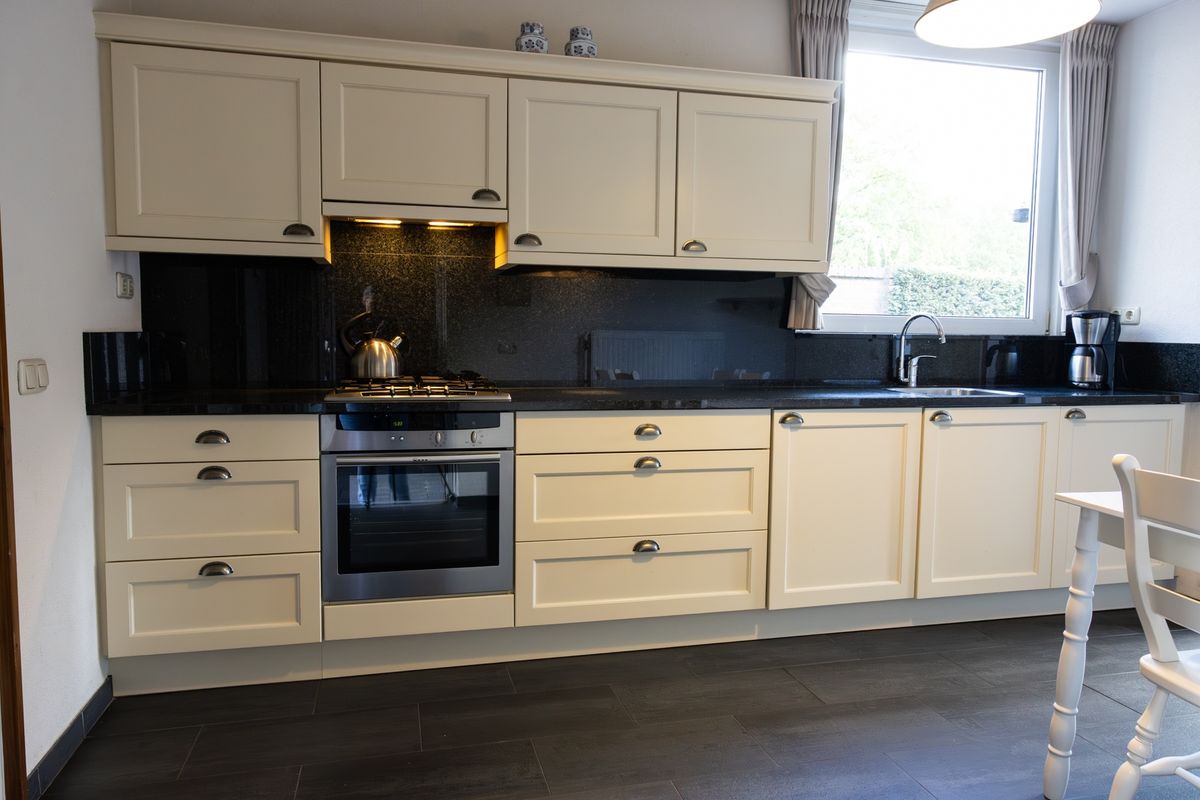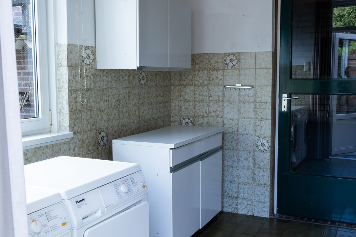 De gesloten keuken is bereikbaar vanuit de woonkamer én via een deur die u bereikt vanaf de oprit. De keuken is voorzien van een gaskookplaat (4 pitten), afzuigkap, spoelbak en koelkast. Aansluitend bevindt zich de bijkeuken met witgoedaansluitingen en doorgang naar de inpandige garage. Vanuit de bijkeuken bereikt u tevens de verzorgde tuin, waar u heerlijk kunt genieten van rust en privacy.