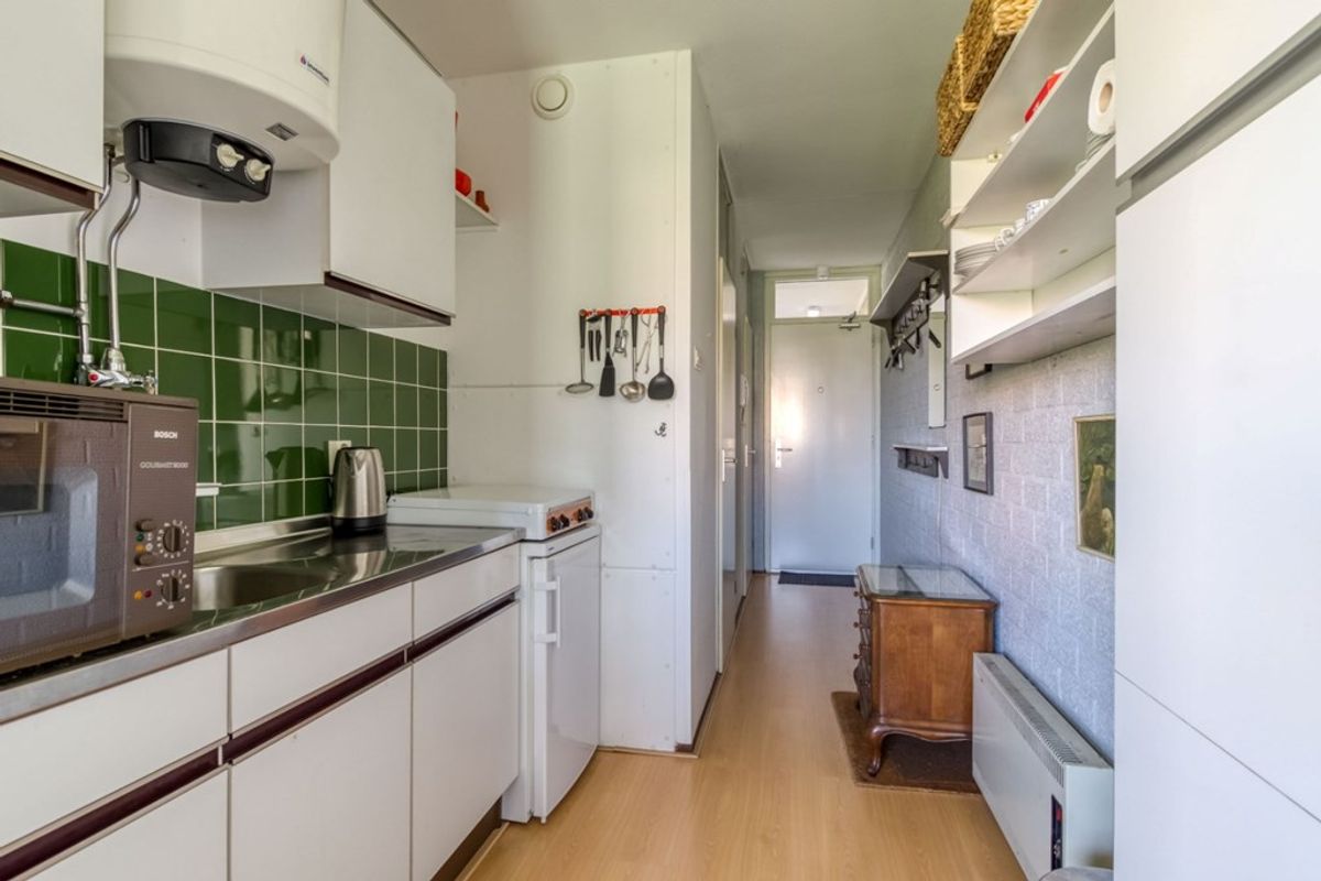Via de gemeenschappelijke inkomhal komt u via de trappenhal bij de voordeur van het appartement. Via de gang met aan het einde de keuken komt u in de woonkamer. De woonkamer heeft een grote raampartij over de volledige breedte van het appartement en een deur naar het op het westen gelegen balkon.
