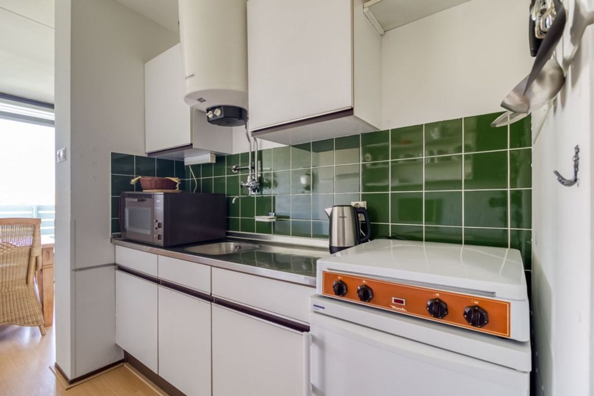 De keuken in het appartement is voorzien van; 4-pits elektrische kookplaat, spoelbak en losse koelkast en oven. De badkamer is voorzien van douche en wastafel. De badkamer is zowel te bereiken vanuit de hal alsook vanuit de slaapkamer. Er is 1 slaapkamer en door het uitklappen van de bedden in de woonkamer is er een volwaardige tweede slaapgelegenheid gecreëerd. Deze ruimte kan afgescheiden worden van de woonkamer met een schuifwand. Apart toilet met fonteintje.