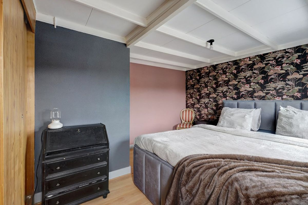 Overloop met toegang tot twee slaapkamers van circa 7 m² en 9 m². De slaapkamer aan de achterzijde is voorzien van een dakkapel, wat zorgt voor extra ruimte en licht. Daarnaast zorgt het grote raam in de punt van het dak voor een natuurlijke lichtinval op deze verdieping. Via een vlizotrap is de vliering bereikbaar, ideaal voor het opbergen van seizoensspullen. Daarnaast beschikken beide kamers over praktische bergruimte achter de knieschotten. Hierdoor wordt de aanwezige loze ruimte optimaal benut