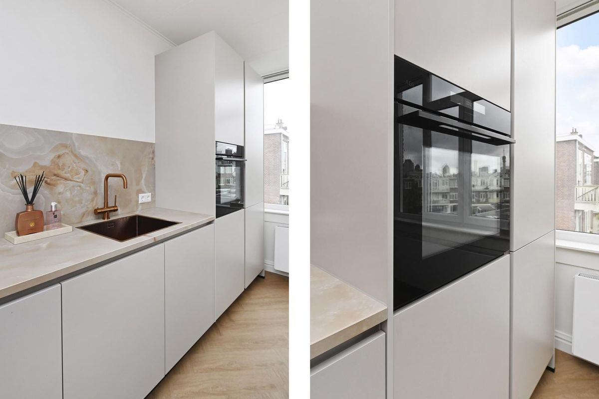 De topetage biedt een ruim woonoppervlak met hoge plafonds en een aangename sfeer. De lichte woonkamer aan de voorzijde heeft grote raampartijen en grenst aan de nieuwe open keuken, uitgevoerd met een royaal kookeiland met zitgedeelte, inbouwapparatuur en marmerlook werkbladen en achterwand – een echte eyecatcher. Deze luxe keuken is uiteraard voorzien van een koel/vrieskast, combimagnetron, inductiekookplaat met downdracht afzuiging en 100 graden kraan!