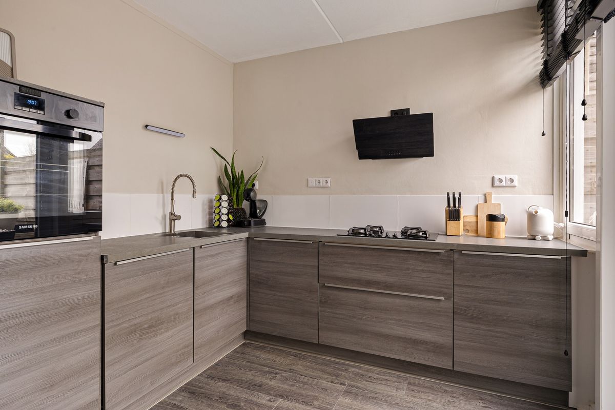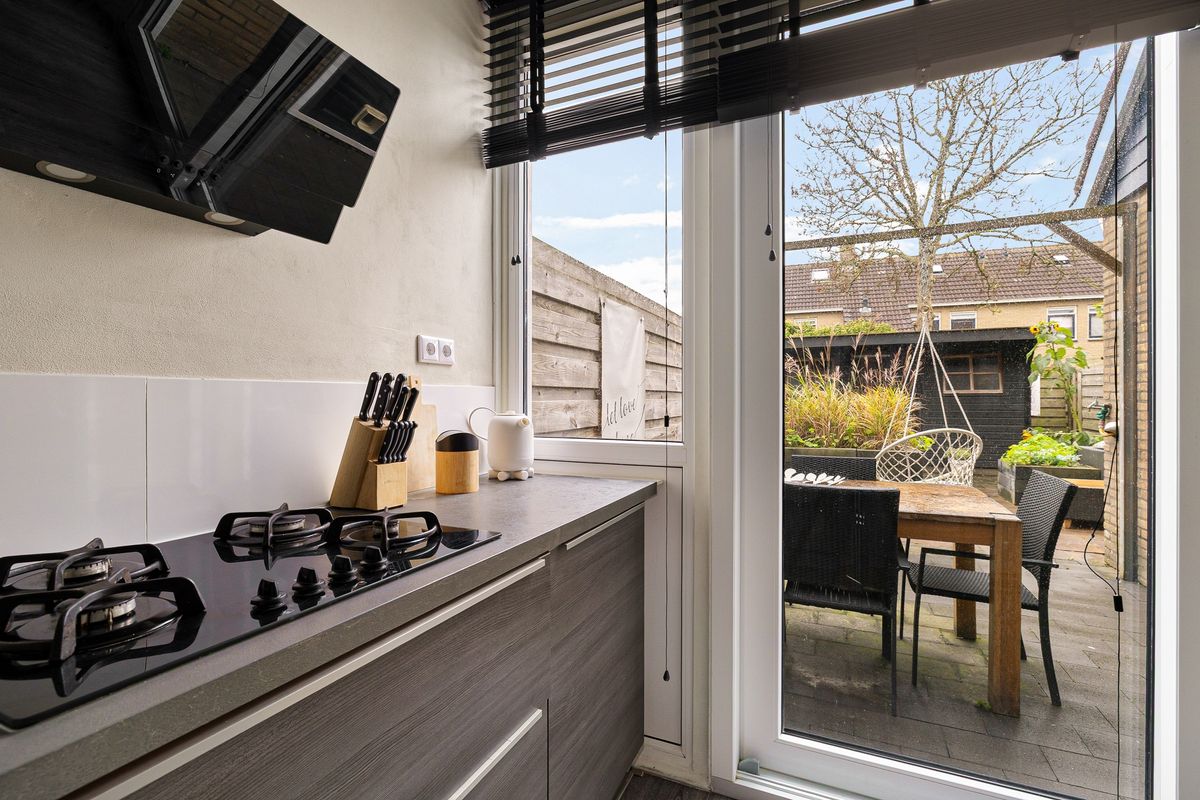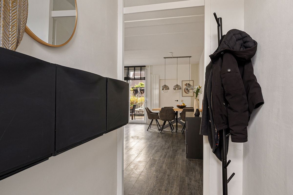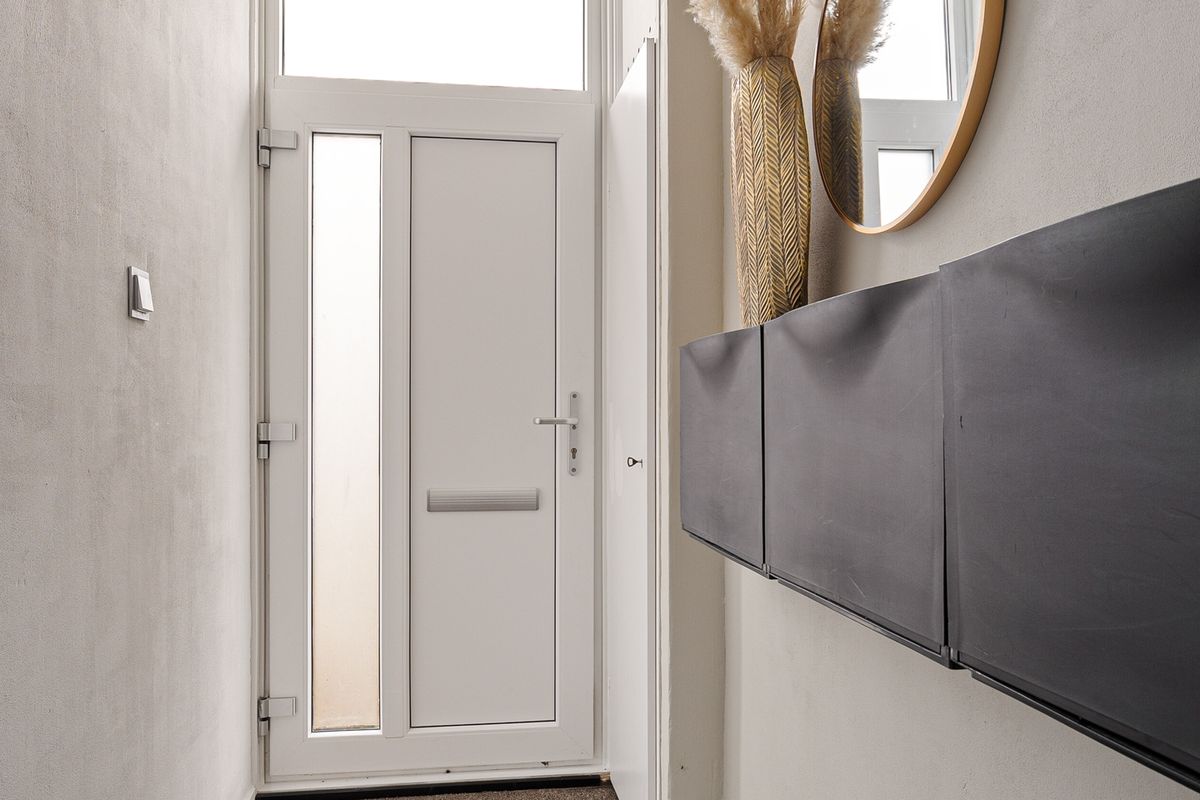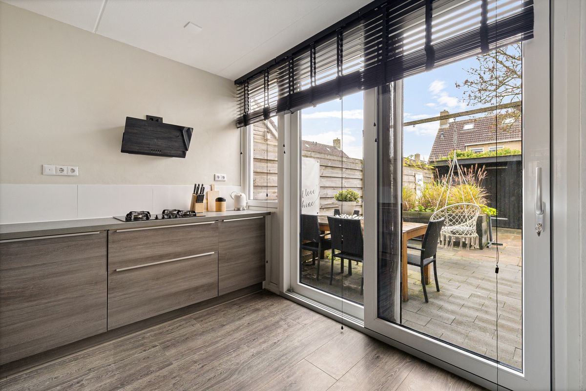 Via de entree kom je in de hal met toegang tot de lichte en ruime woonkamer. Aansluitend bevindt zich de moderne keuken, voorzien van diverse inbouwapparatuur en een schuifpui. De bijkeuken beschikt over een wasmachine- en drogeraansluiting, vlizotrap naar vliering en een deur naar de achtertuin.
