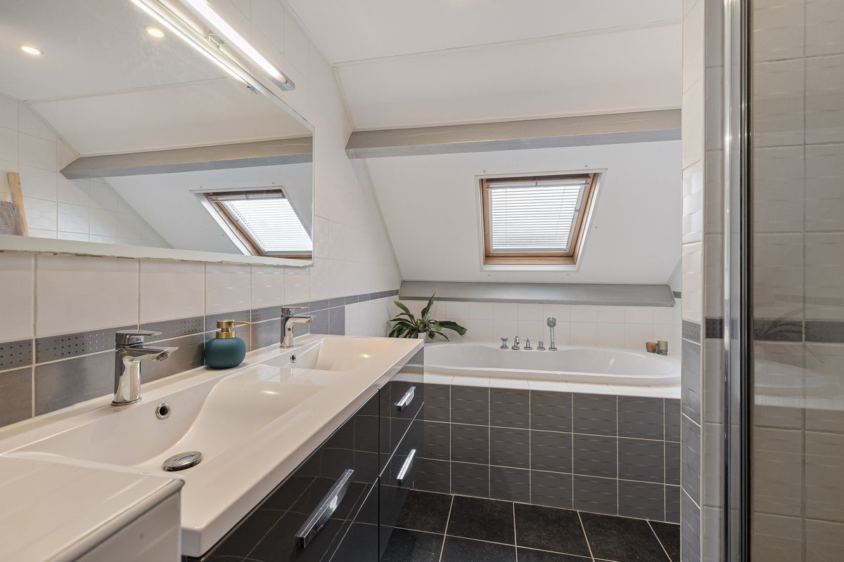 De overloop geeft toegang tot twee slaapkamers en de ruime badkamer, uitgevoerd met ligbad, douche, toilet, dubbel wastafelmeubel en designradiator. Via de trapopgang op de overloop is de tweede verdieping bereikbaar.