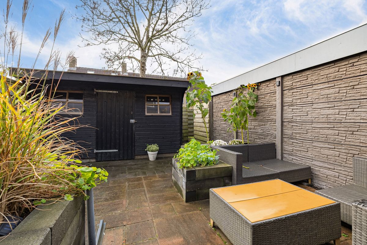 De tuin is onderhoudsvriendelijk ingericht en beschikt over een ruime berging, ideaal voor fietsen en tuingereedschap.