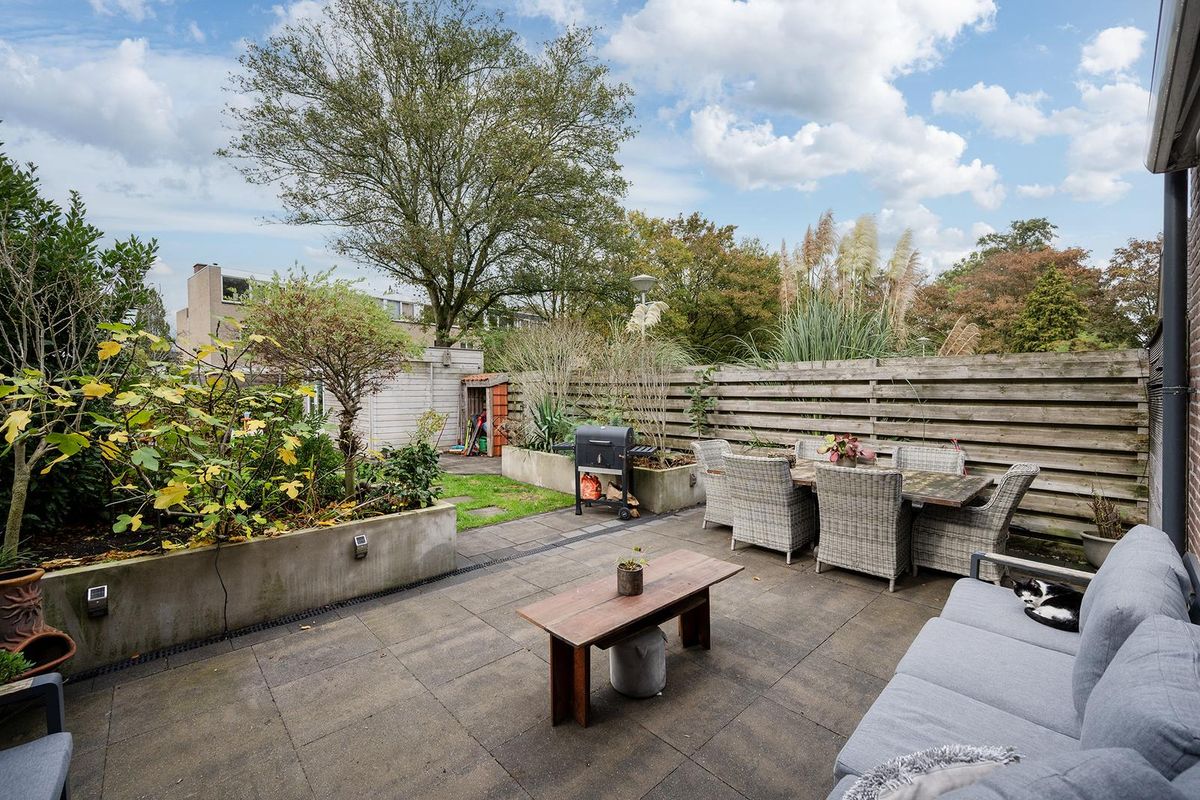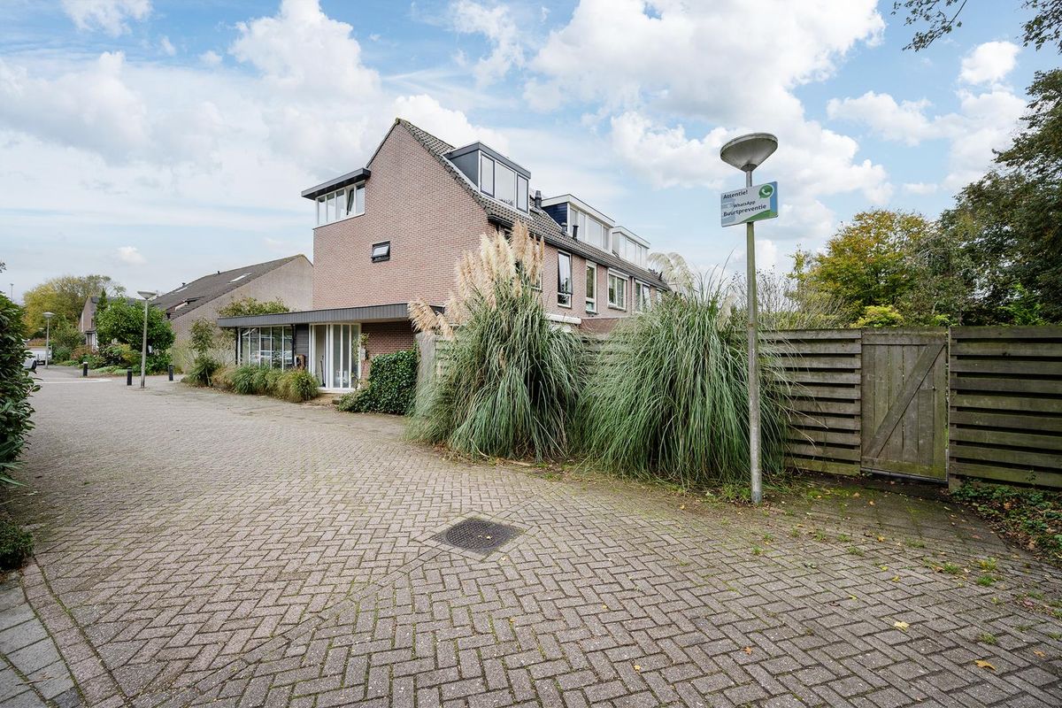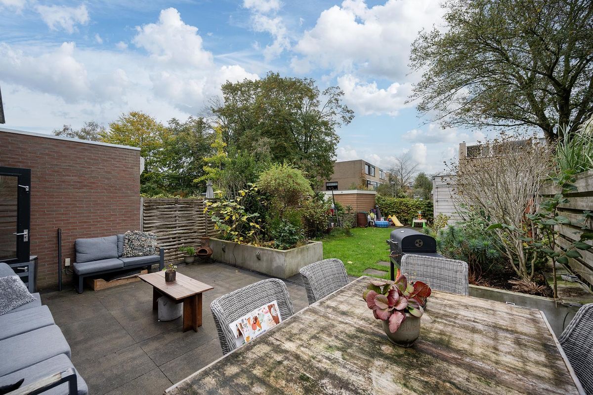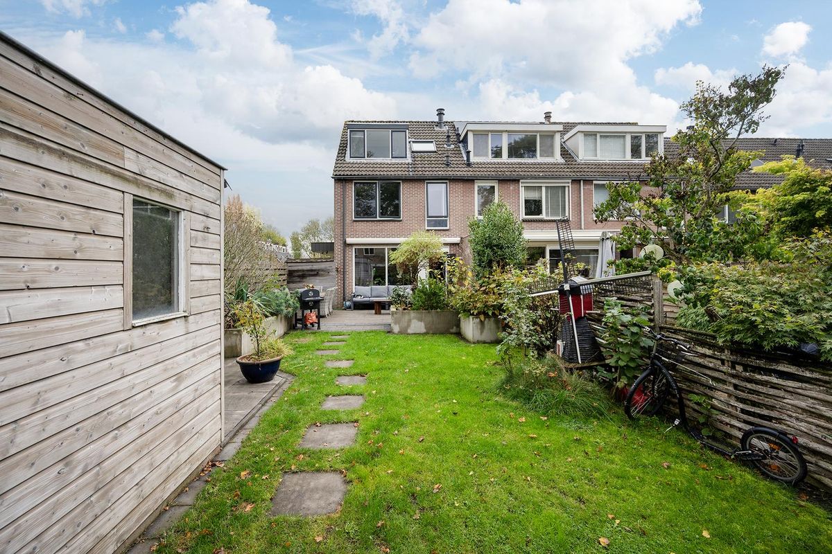 De woning heeft, dankzij de hoekligging, een grote voortuin, een zij tuin en een ruim 17m diepe achtertuin gelegen op het Zuid Westen. De achtertuin beschikt over 2 terrassen, met elkaar verbonden via stapstenen in een groot grasveld. Het terras achter in de tuin ligt aan een sloot en het andere terras bij de achtergevel van de woning. Hierdoor kan er altijd wel een plekje gevonden worden in de zon of in de schaduw dankzij het elektrisch bedienbare zonnescherm aan de achtergevel. Achterin de tuin treft u ook een dubbele houten schuur van totaal 16m2. De achtertuin is te bereiken via de zij-tuin en via een openslaande deur in de achtergevel.