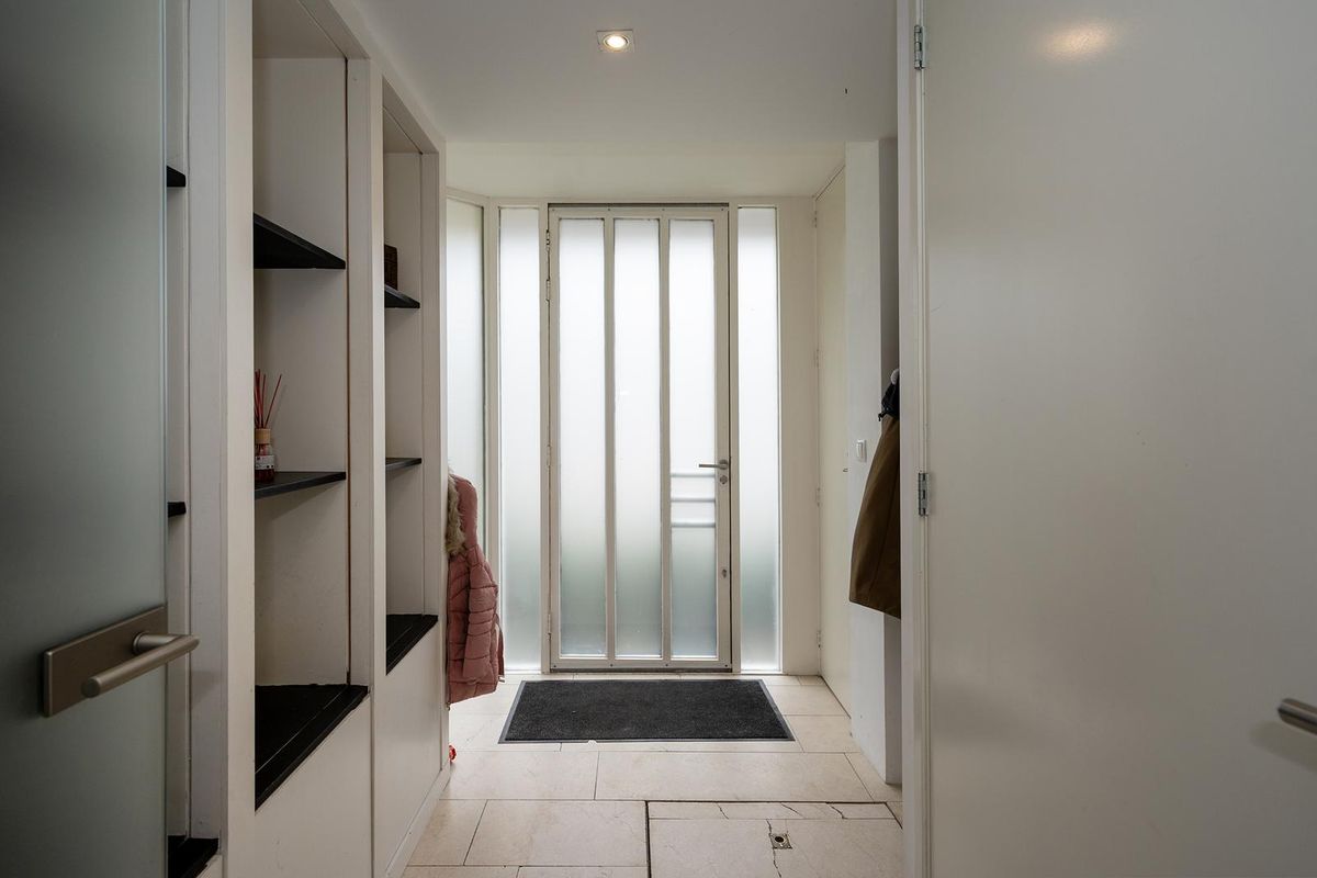 Grote voortuin met groene border en betegelde oprit. U bereikt de overdekte entree via een bestraat pad met eigen laadpaal aan de zijkant van de woning. U komt de woning binnen in een ruime hal met garderobe mogelijkheid en vaste kastenwand. Vanuit de hal heeft u toegang tot de woonkamer, de meterkast en de toiletruimte. De toiletruimte beschikt over een hangtoilet en fonteintje. Op de grond ligt een nette natuurstenen vloer, naadloos doorgetrokken vanuit de hal naar toilet en keuken.