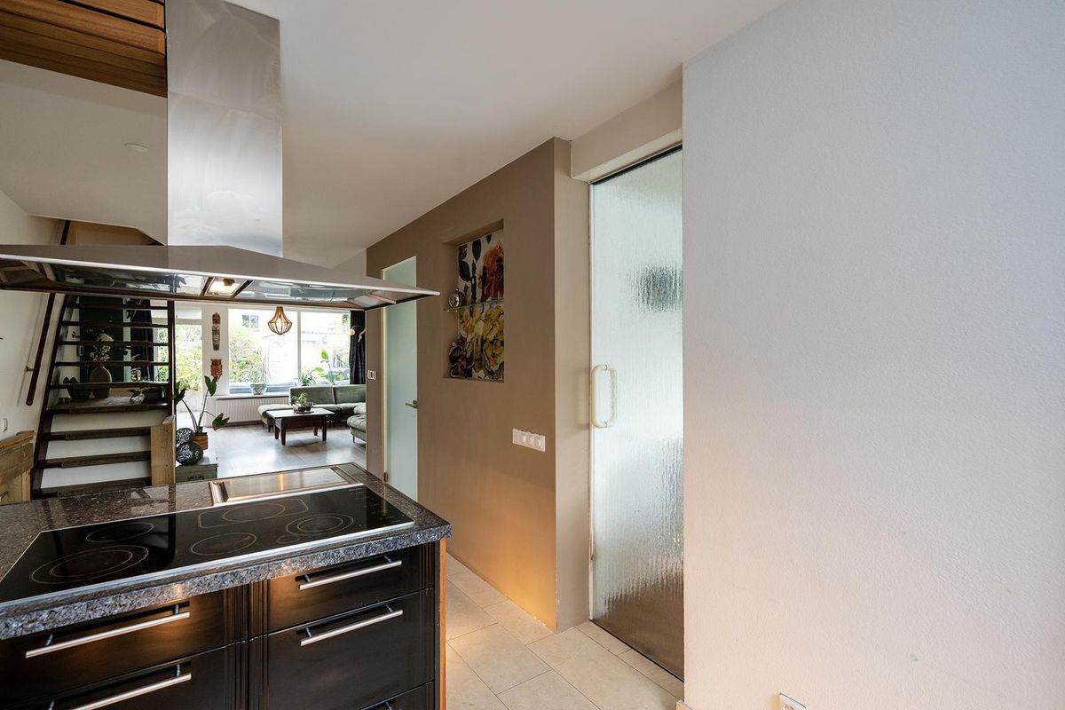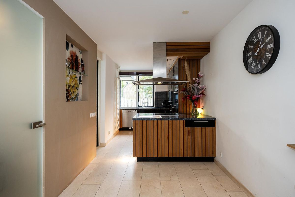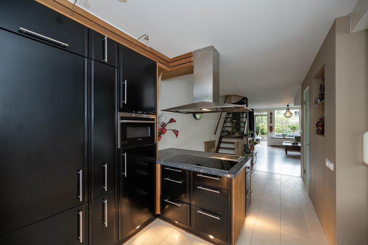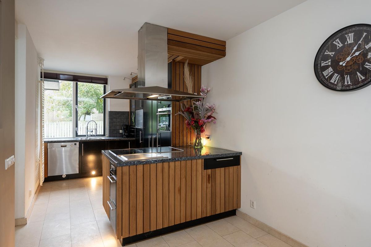De royale woonkamer is tuingericht en heerlijk licht dankzij de grote glazen pui aan de achterzijde en het zijraam. U kunt hier een zeer ruime zithoek creëren rondom de tv wand met hout gestookte natuurstenen haard. Op de vloer ligt een mooie laminaat vloer in de kleur licht eiken. Een lange eettafel kunt u kwijt in de separate eetkamer naast de keuken. Deze ruimte is aan 2 zijden voorzien van een glazen pui van plafond tot vloer waardoor u goed zicht hebt op zowel de voor- als zijtuin. Via een luik is de kelder met veel opbergruimte en een hoogte van 2m23 te bereiken. De moderne U-keuken is open en beschikt over een kookeiland met inbouwapparatuur zoals een teppanyaki bakplaat, een 5 pits inductie kookplaat en een combi-oven. Veel kastruimte heeft u dankzij de vele keukenkastjes in het eiland en in de hoge kastenwand. Hier treft u ook een grote koelkast met aparte vriezer. Het natuurstenen aanrechtblad biedt veel werkruimte en hier treft u verder een dubbele spoelbak met mengkraan, een boiler, een vaatwasser en goed zicht op de voortuin.