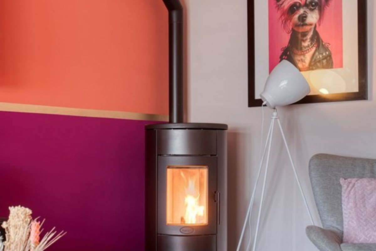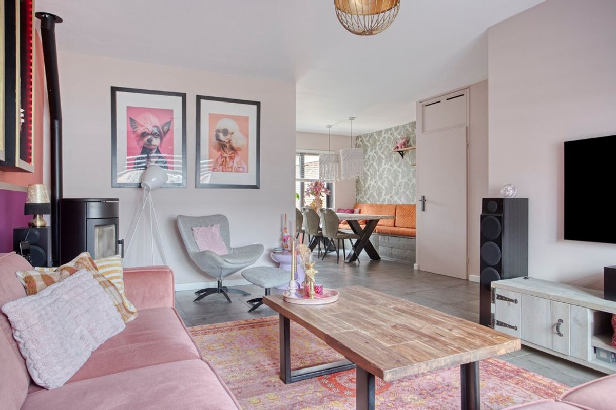 Gezellige en smaakvol ingerichte woonkamer met houtkachel en praktische trapkast.