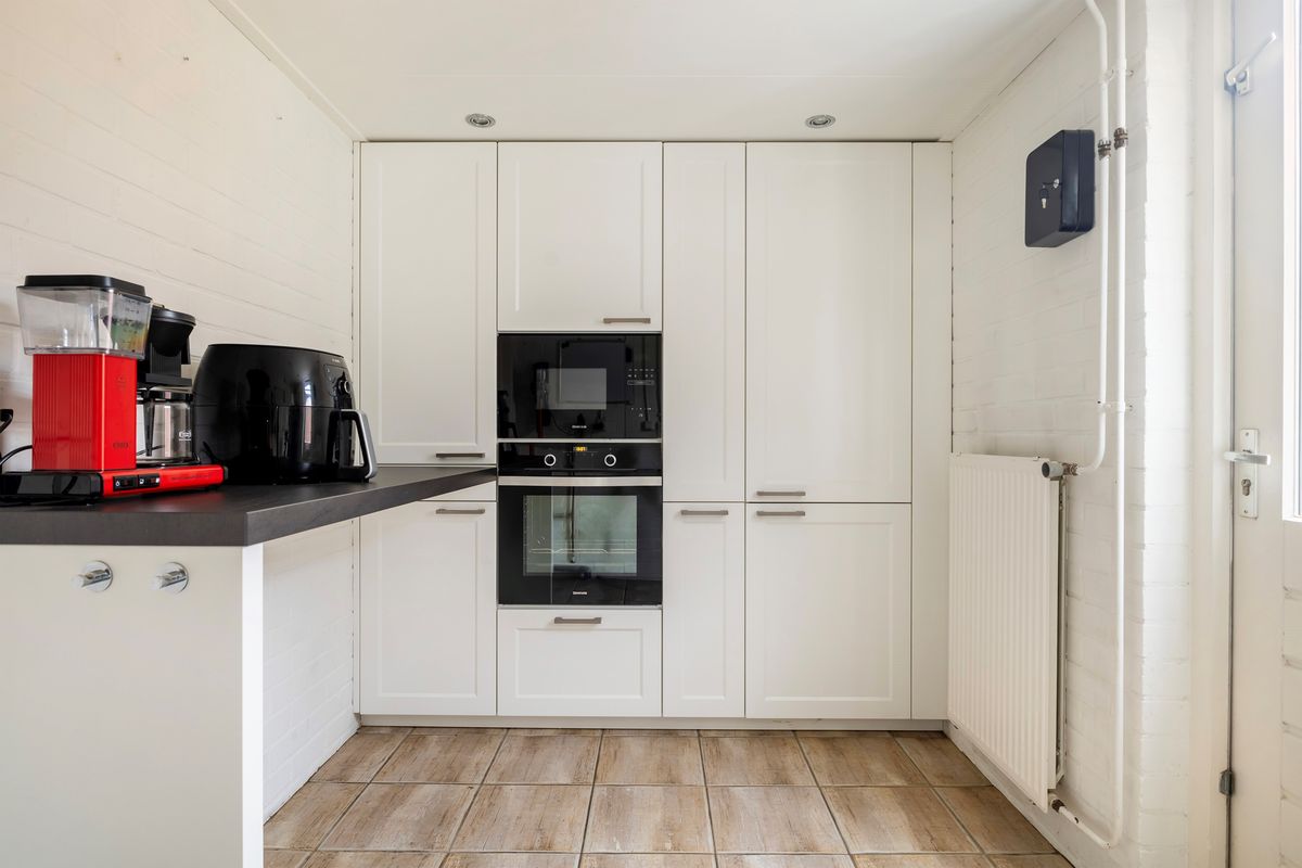 • Bijkeuken met een kastenwand in de stijl van de keuken en voorzien van een koel-vriescombinatie, oven en magnetron.