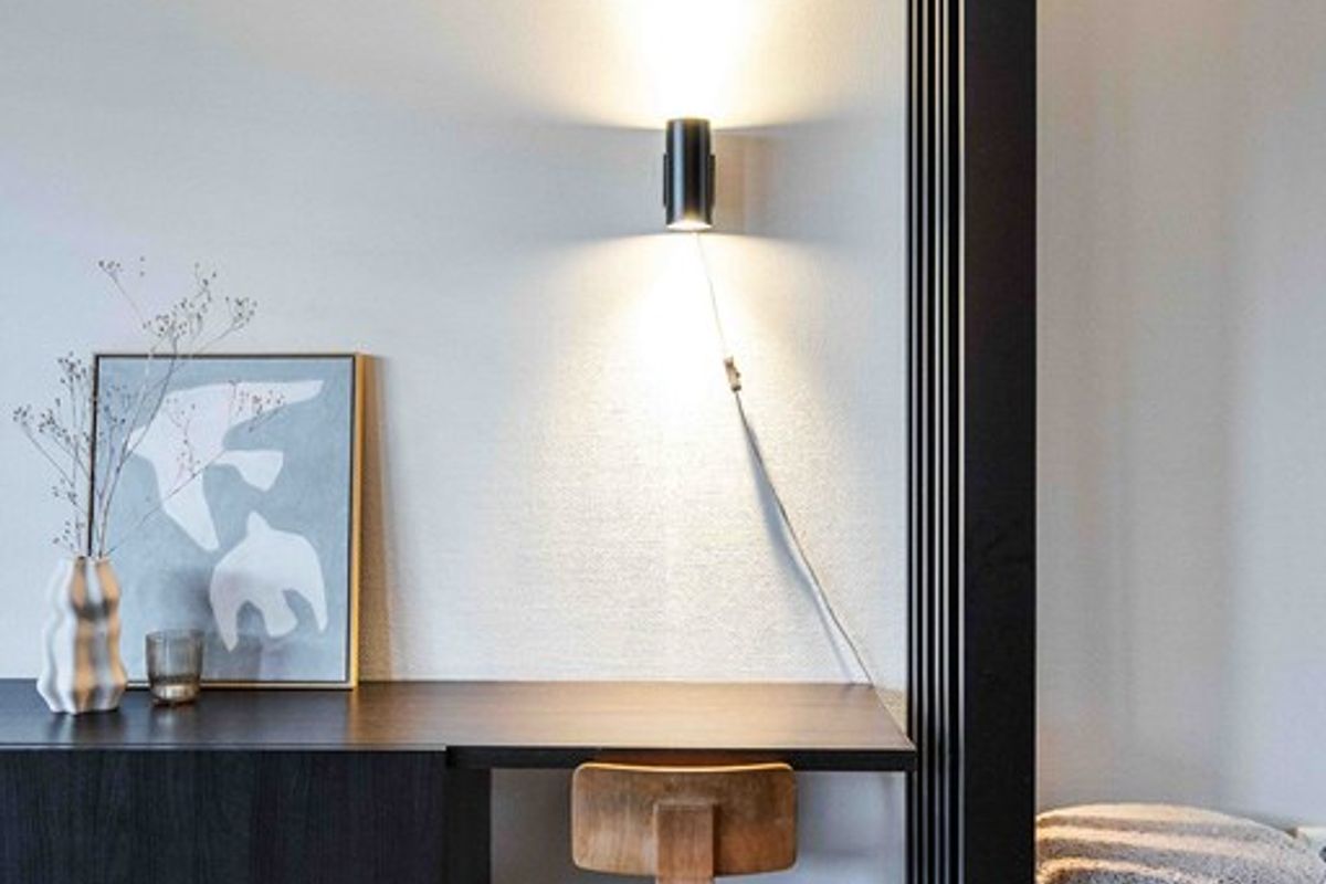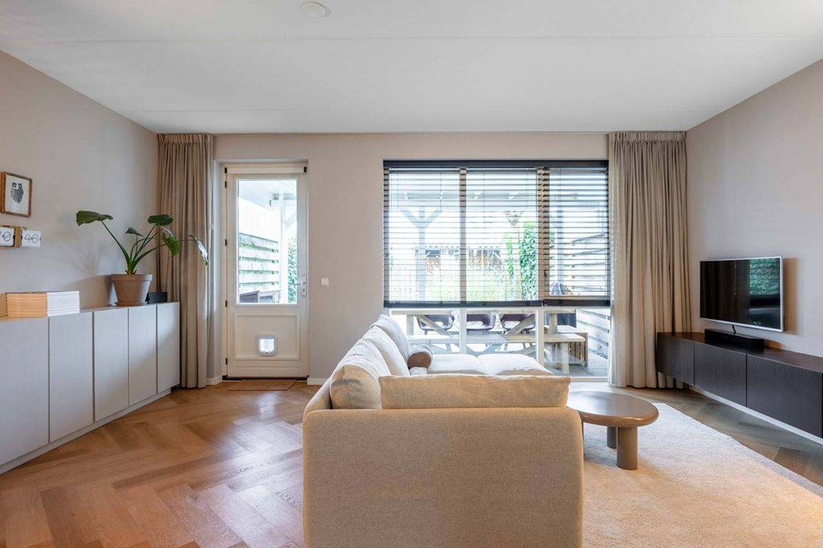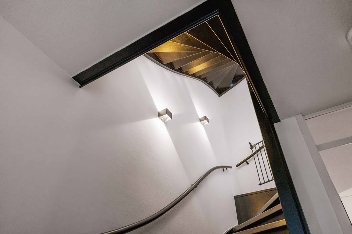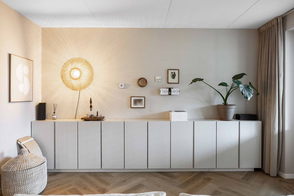 De trapkast in de woonkamer zorgt voor extra opbergruimte.