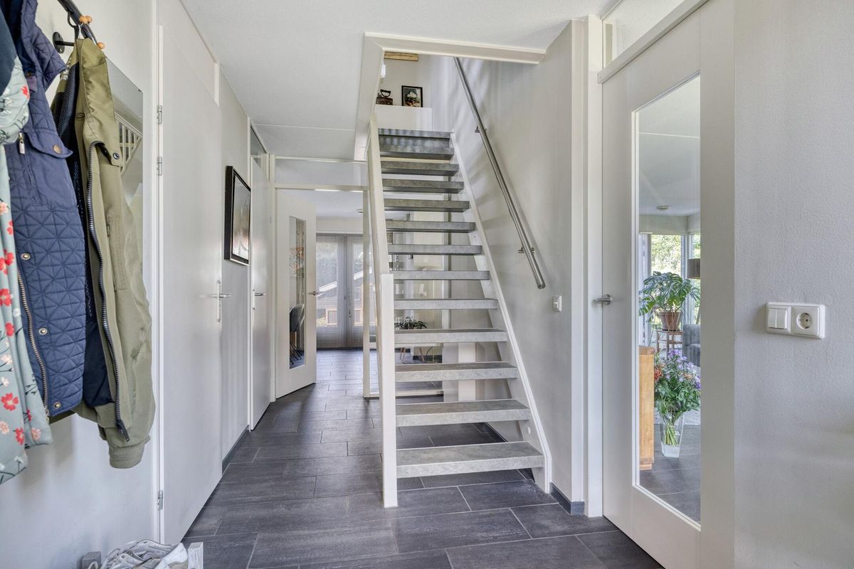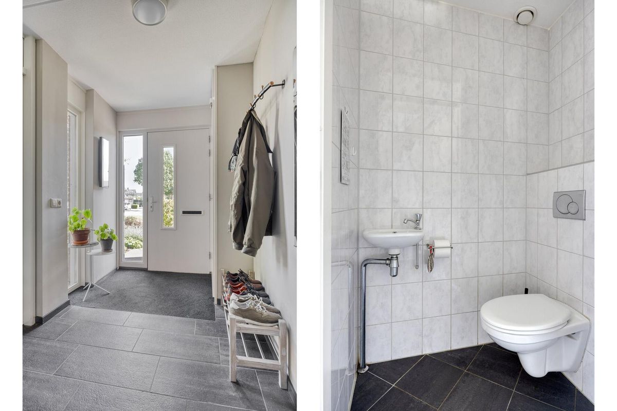 Via de oprit is de entree van de woning te bereiken. Lichte hal met trapopgang naar de 1e verdieping, meterkast, toegang naar de inpandige garage, wandtoilet met fontein, toegang naar zowel de open keuken als de woonkamer.