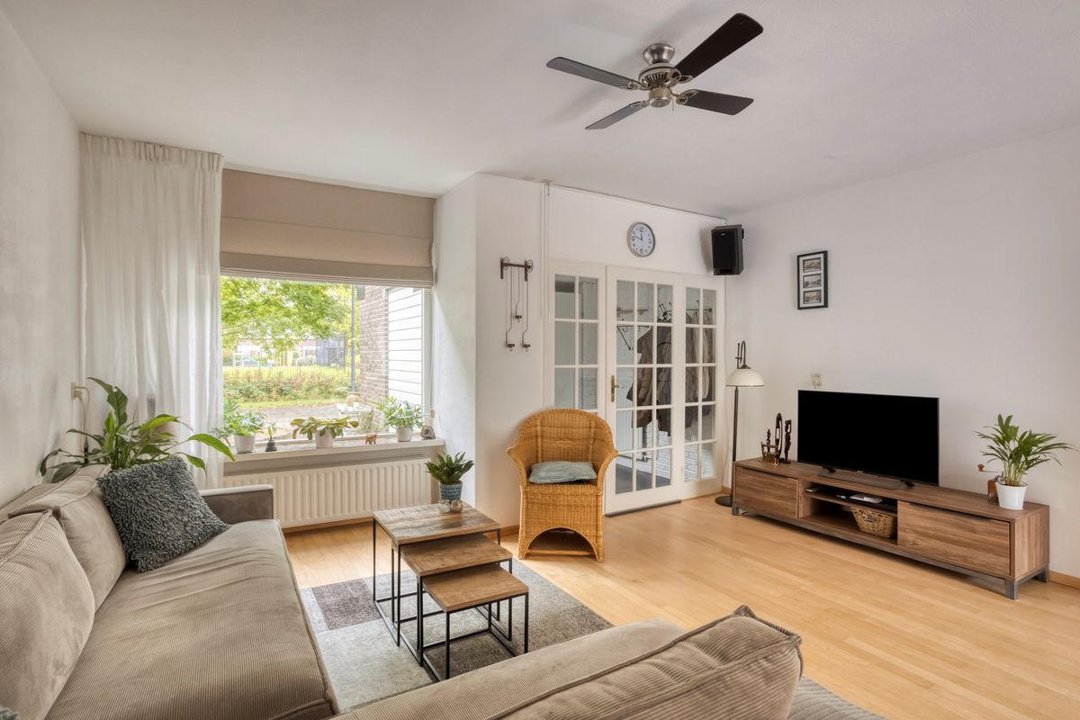Gezellige living met massief houten parketvloer en de wanden zijn behangen. Vanaf uw bank geeft een groot raam met ventilatierooster zicht op de speelveldjes achter de sloot en heeft u vrij uitzicht. Onder de open trap is een plateau geplaatst voor de computer of een speelhoekje voor de kleintjes.