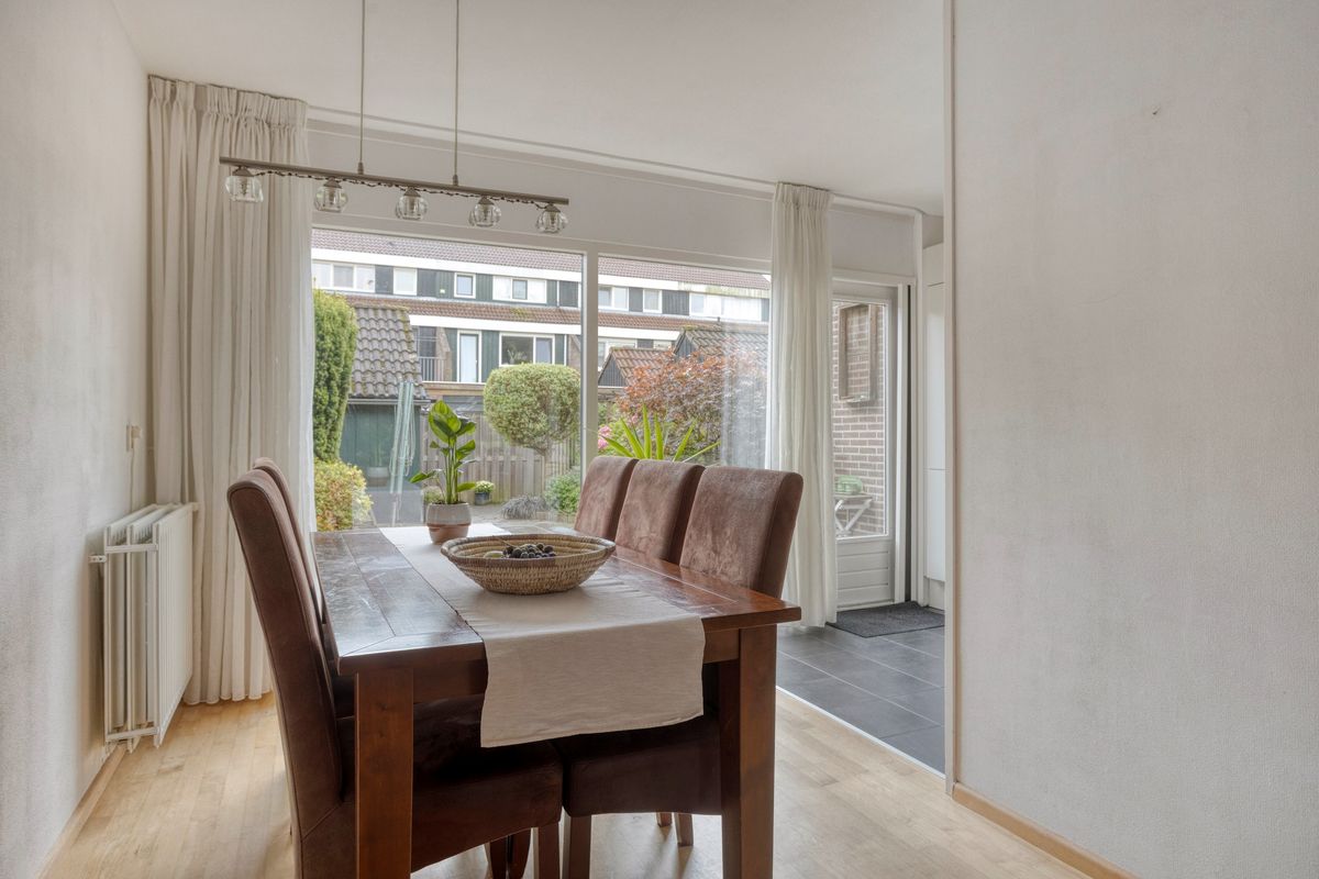 Bij de eethoek geven grote raampartijen tot aan de vloer zicht op de tuin dus heel fijn lichtinval. En als het heel erg zonnig is kan het elektrisch te bedienen zonnescherm worden uitgezet.