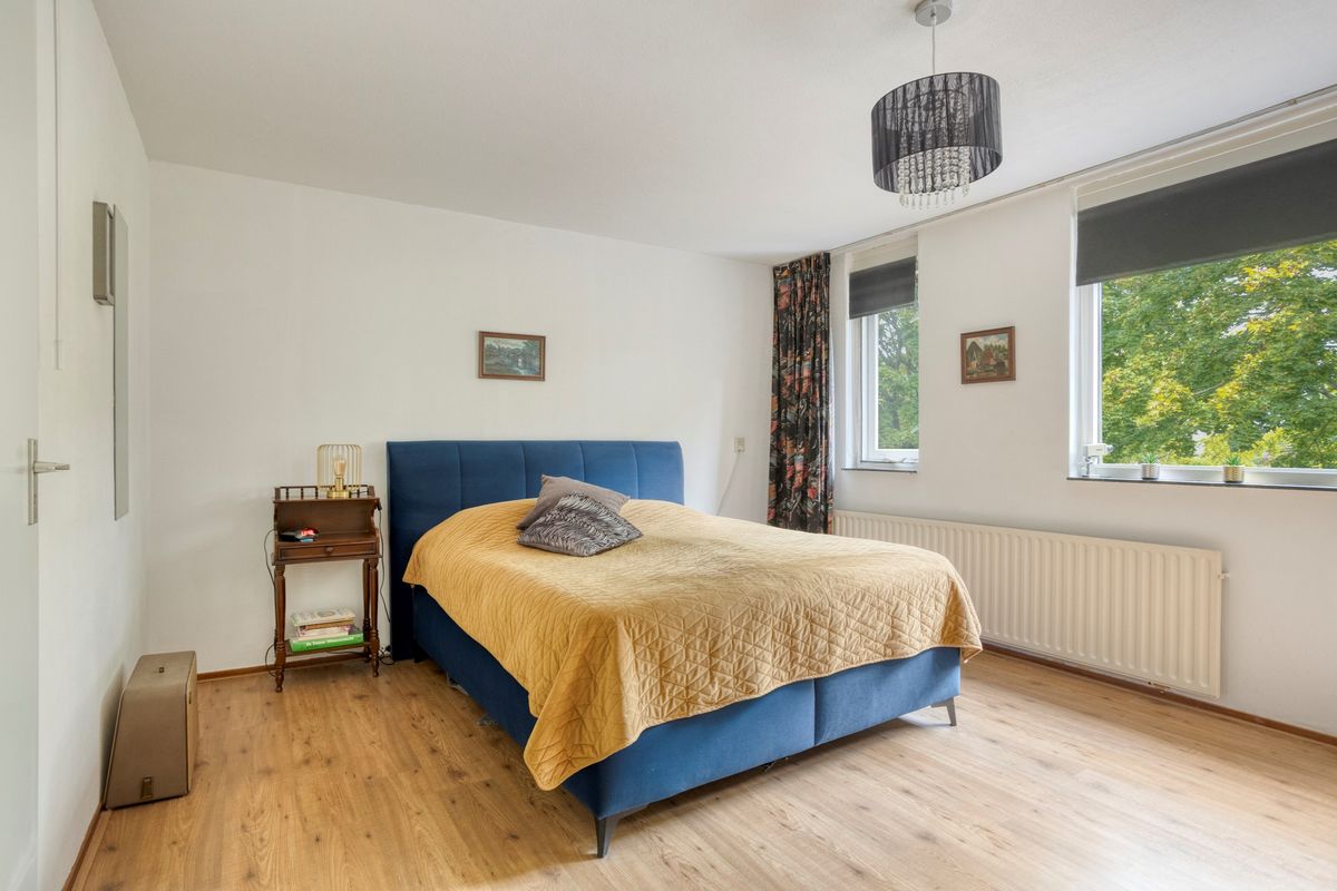 1e Slaapkamer voorzijde – riante slaapkamer over de gehele breedte van de woning met een vaste kastenwand, het raam kan open en een deur geeft toegang tot het balkonnetje met zicht op veel groen en de speelveldjes. Alleen deze kamer heeft nog enkel glas in de houten kozijnen en mocht het nodig zijn dan kunnen hier 2 kamers worden gerealiseerd.