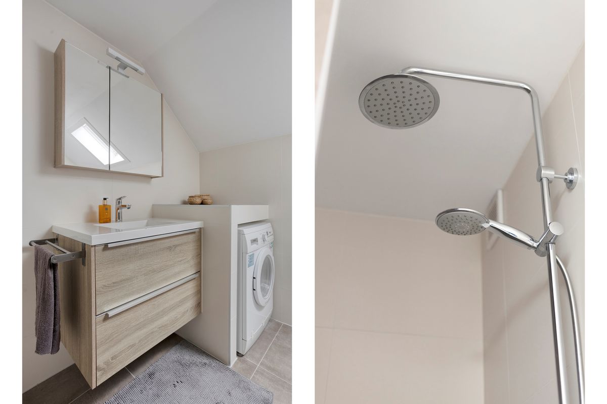 De badkamer met modern betegelde wanden en dito vloer voorziet in een 2e wandcloset, designradiator, wastafelmeubel met zijplateau’s, 2 laden, een spiegelkastje met verlichting en tot slot een douchehoek met thermostaatkraan, hand- en regendouche, drainafvoer, koofje voor de shampoo en een zitplateau. Hoe lekker is dat … na een lange werkdag even zitten tijdens het douchen! Voor de ventilatie zit er een centraal afzuigsysteem en het Velux dakraam kan open voor de natuurlijke ventilatie. Het plafond is gestuukt en is voorzien van inbouwspots. Voor de wasmachine is een betegelde ombouw gemaakt met een eveneens betegeld plateau.