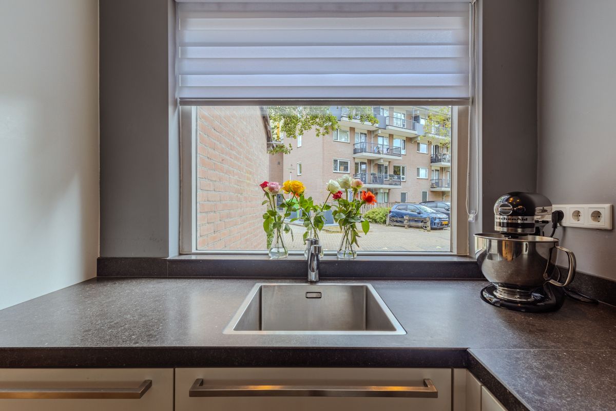 Entree in de hal voorzien van een ruime bergkast, garderoberuimte, keurige en geheel betegelde toiletruimte voorzien van een zwevend toilet en een sanitairmeubel met fonteintje en meterkast. De sfeervolle woonkamer met airconditioning en een praktische vaste kast biedt de trapopgang naar de etage. Het zitgedeelte is aan de achterzijde gecentreerd, hier kijk je door de grote raampartij leuk weg naar de tuin met lounge-tuinhuis en de daarachter gelegen bomen van het park. Het eetgedeelte scheidt de ruimte met de keuken. Deze ruime en moderne keuken in L-opstelling bevindt zich aan de straatzijde en is uitgerust met een elektrische boiler en waterontharder. Hier vind je naast de lades en kasten diverse inbouwapparatuur als een inductiekookplaat met afzuigkap, een combi-oven, een koel-/vriescombinatie en een vaatwasmachine.