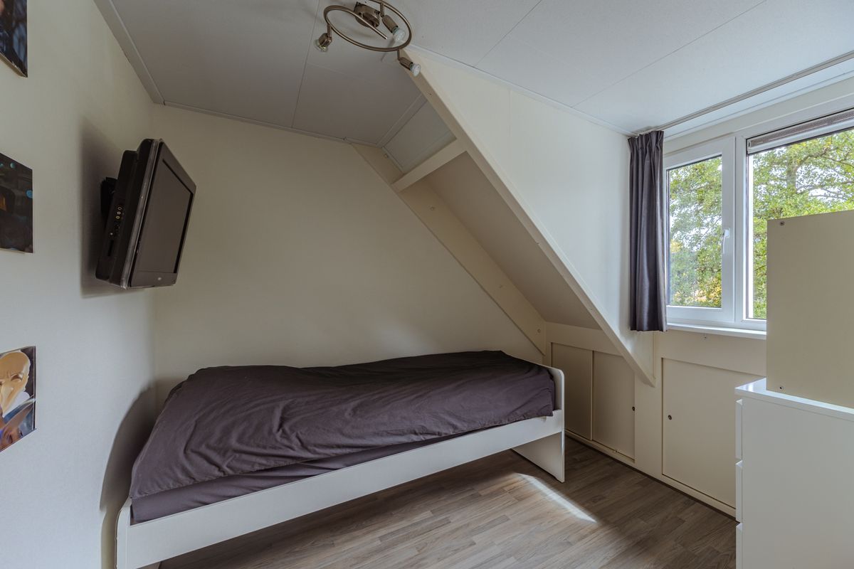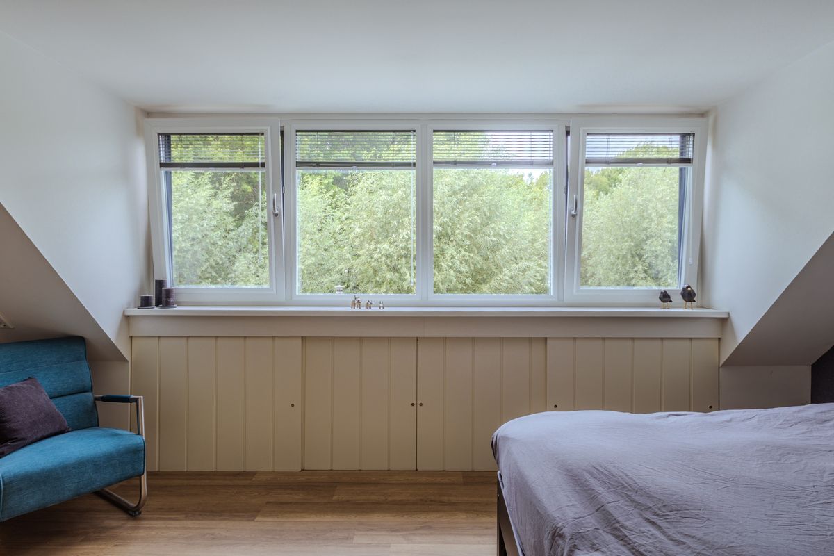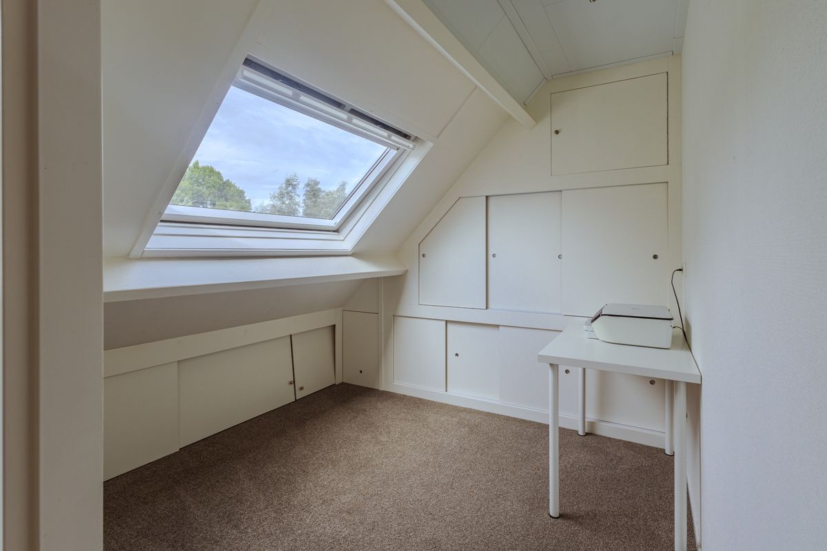 De overloop beschikt over een dakraam en berging achter de knieschotten, van hieruit toegang tot 2 slaapkamers en de wasruimte / technische ruimte. Deze ruimte met dakkapel herbergt de witgoedaansluitingen, de CV-installatie (2023), de zonnepanelenomvormer (2022) en biedt bergingsmogelijkheden achter de knieschotten. Deze 3de slaapkamer is gelegen aan de straatzijde en is uitgerust met een dakkapel en biedt bergruimte achter de schotten. De laatste slaapkamer is aan de tuinzijde gesitueerd, heeft een groot Velux dakraam en biedt eveneens diverse vaste bergmogelijkheden. Boven beide slaapkamers is een vliering gecreëerd welke vanaf de overloop bereikbaar is.