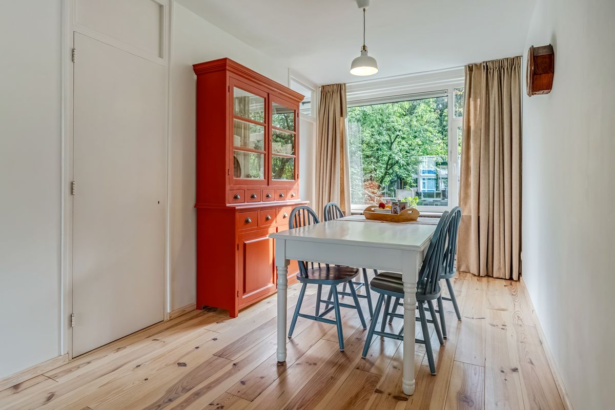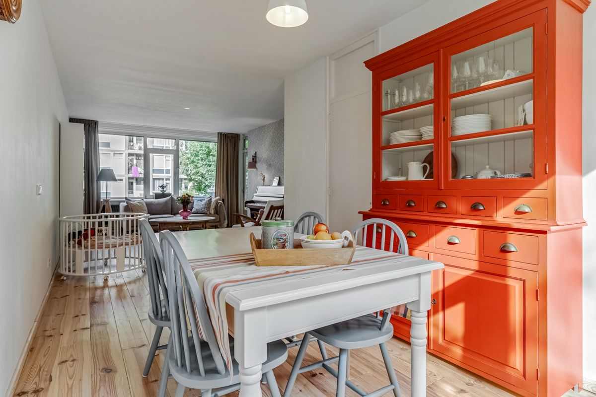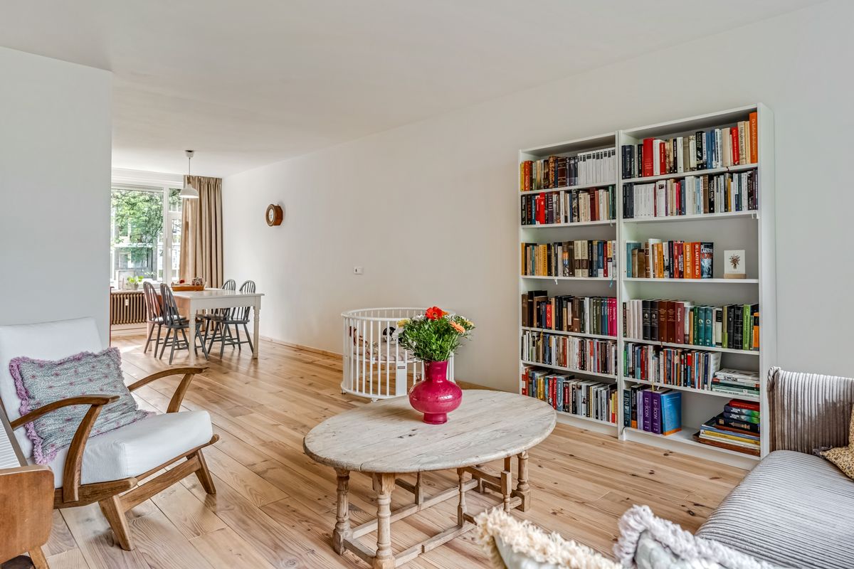 De lichte en ruime woonkamer heeft een warme Scandinavische sfeer met grote raampartijen, een massief houten vloer en toegang tot het balkon op het westen.