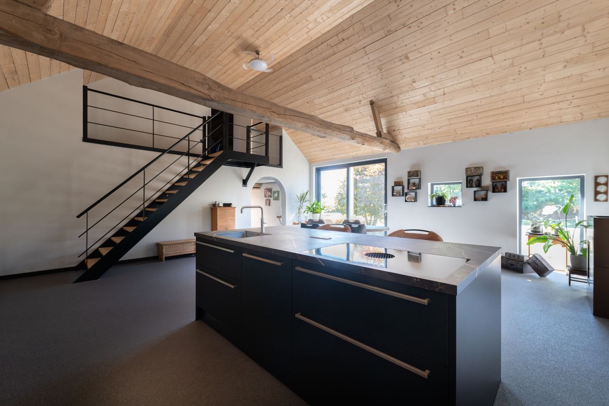 • Ruime, sfeervolle woonkamer met vloerverwarming, grote pelletkachel en elektrische rolluiken