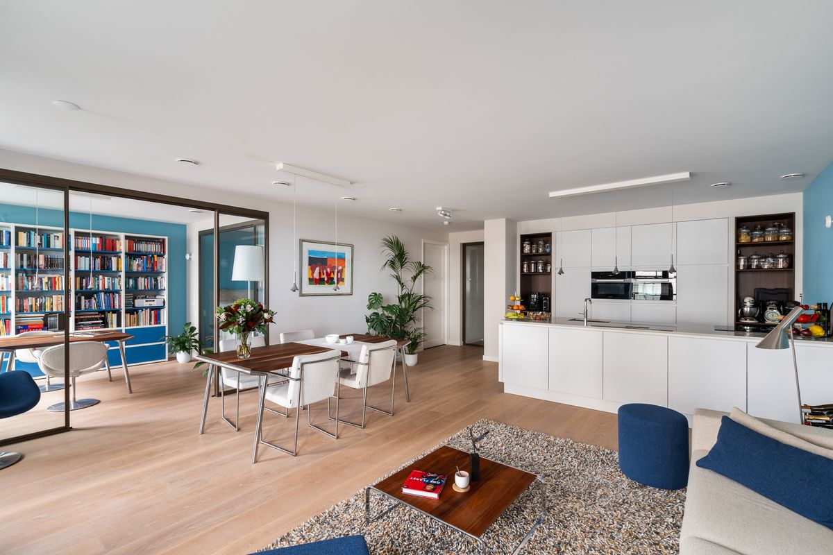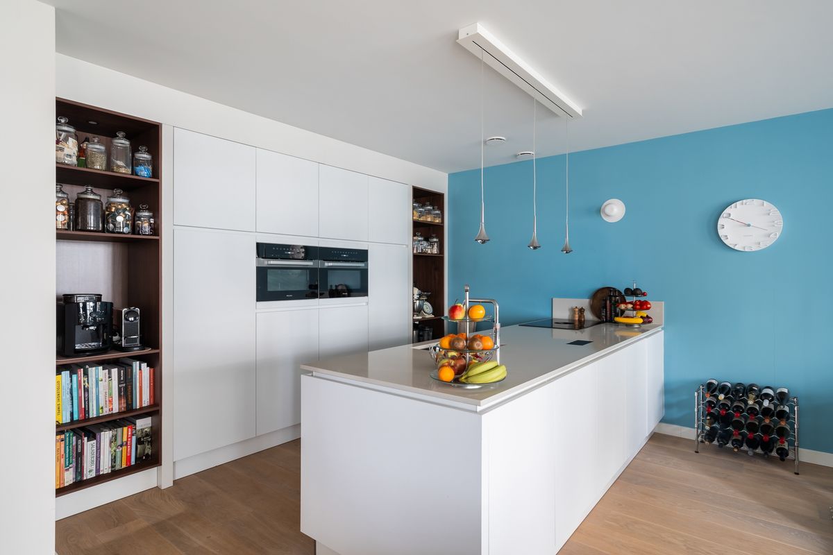 De open keuken is modern en compleet ingericht met hoogwaardige inbouwapparatuur zoals 2 combi-ovens van Miele, Bora inductiekookplaat met geïntegreerde afzuiger en kokendwaterkraan. Het kookeiland zorgt nog voor extra veel opbergruime. Hier komen koken en leven moeiteloos in één ruimte samen.