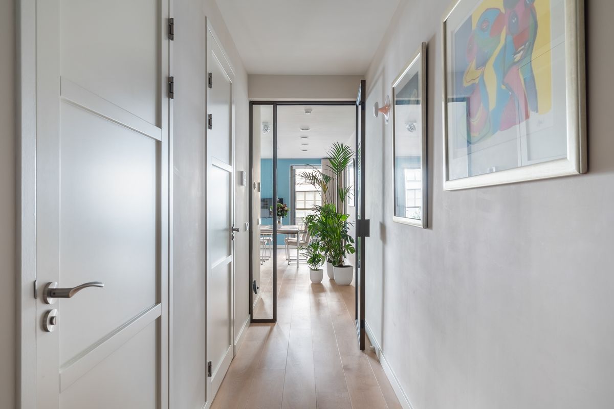Bij binnenkomst via de ruime hal merk je meteen de hoogwaardige afwerking waaronder de massief houten vloer, de luxe deuren en glazen wanden.