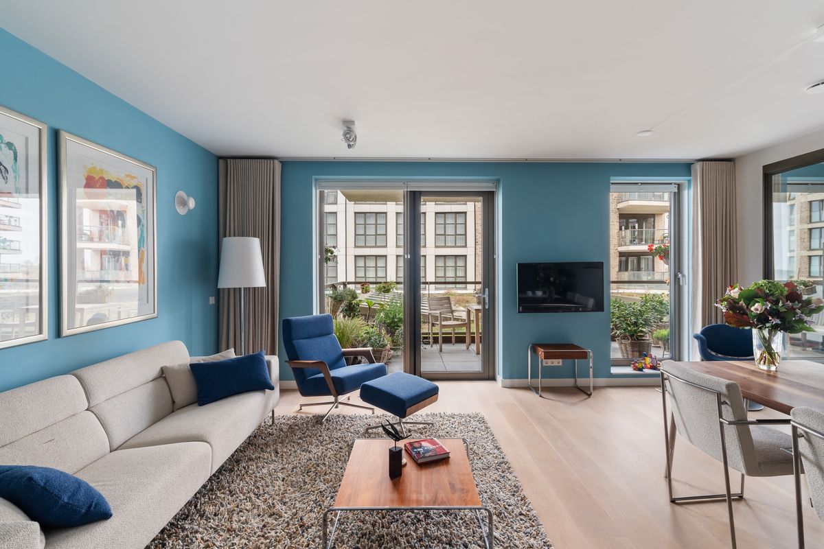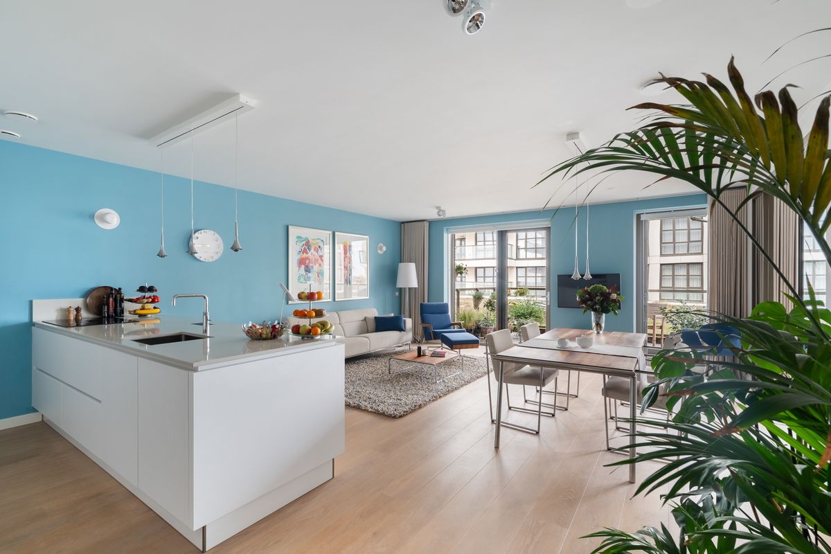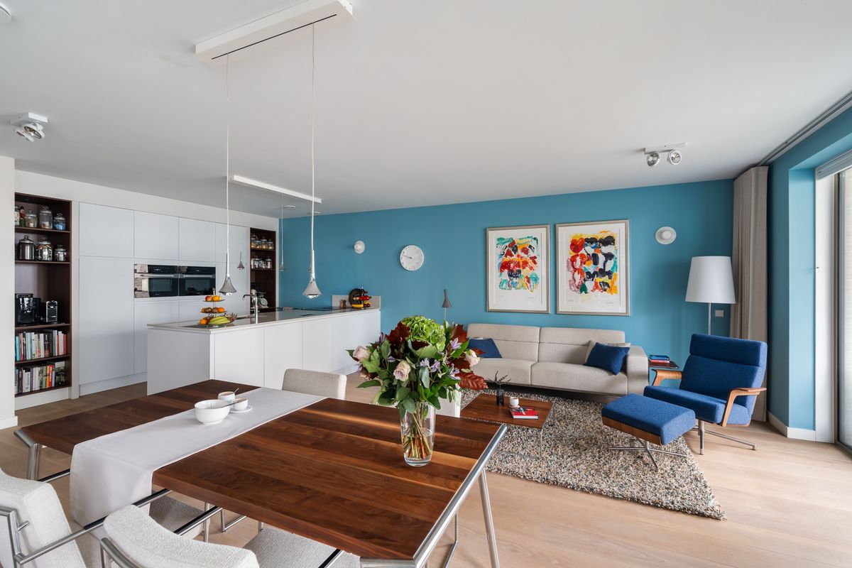 De royale woonkamer vormt samen met de open keuken het hart van de woning. Dankzij de grote raampartijen geniet je hier van veel daglicht en een prachtig uitzicht richting zee. De woonkamer heeft een directe doorgang naar het ruime terras van bijna 20 m² (noordoosten), dé perfecte plek om ’s ochtends koffie te drinken of te genieten van het vrije uitzicht op de zee.
