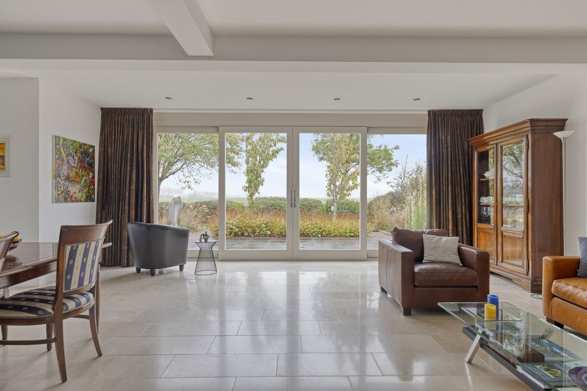 Bij binnenkomst via de ruime L-vormige entree valt direct de luxe uitstraling op: een natuurstenen vloer met vloerverwarming, strakke wanden en plafonds die door de gehele begane grond zijn doorgevoerd (m.u.v. de badkamer). De lichte doorzonwoonkamer is voorzien van een houtkachel en een raampartij over de volle breedte aan de achterzijde, met panoramisch uitzicht over de landerijen. De woonkamer staat in directe verbinding met de halfopen keuken, deze is luxe afgewerkt en voorzien van diverse inbouwapparatuur: inductiekookplaat, afzuigkap, oven, koelkast, vaatwasser en een granieten aanrechtblad. Aan de voorzijde bevindt zich een ruime slaapkamer, momenteel in gebruik als kantoorruimte. Tegenover deze kamer bevindt zich de badkamer, uitgerust met inloopdouche, toilet en wastafel. Via de hal is de inpandige garage bereikbaar, voorzien van een loopdeur, garagedeur, aansluitingen voor wasmachine en -droger, en een vlizotrap naar de zolder, waar de hybride warmtepomp is geplaatst.
