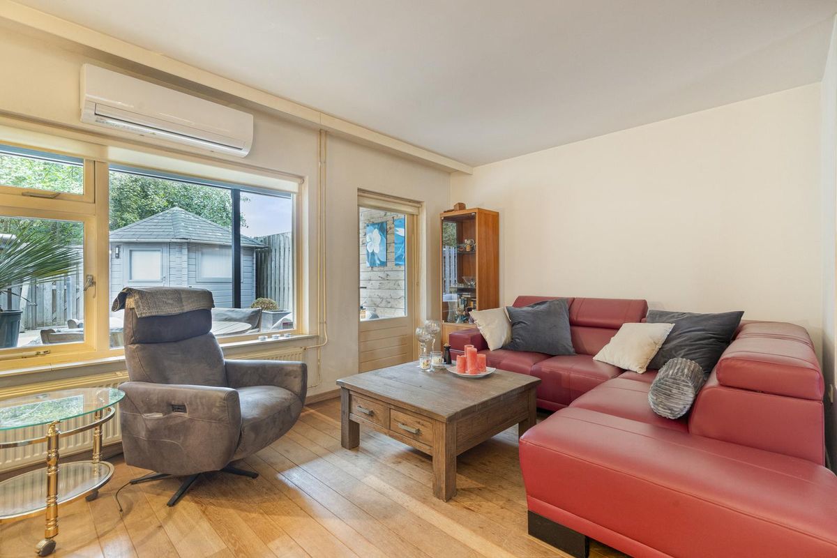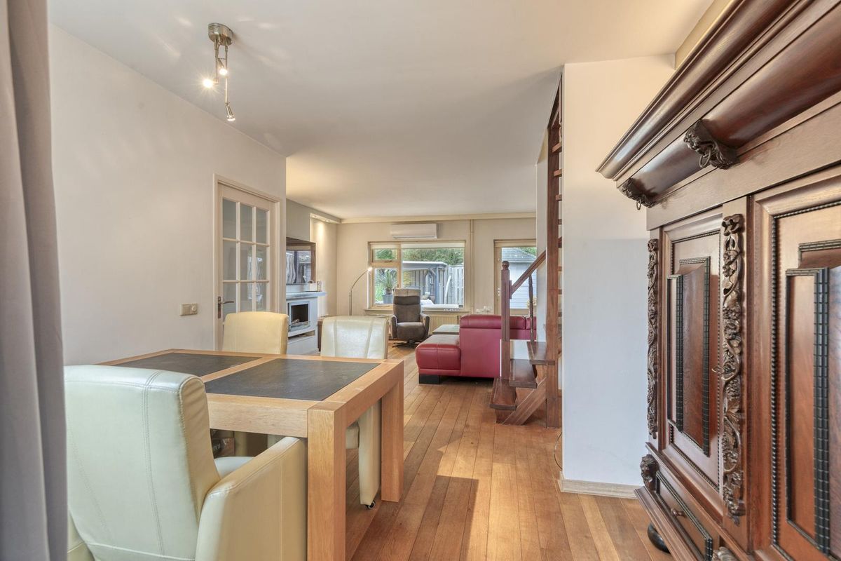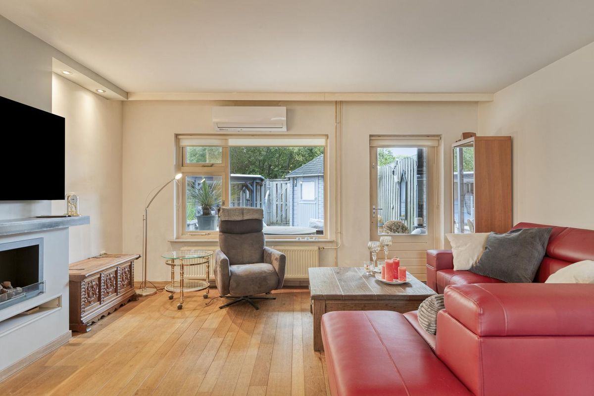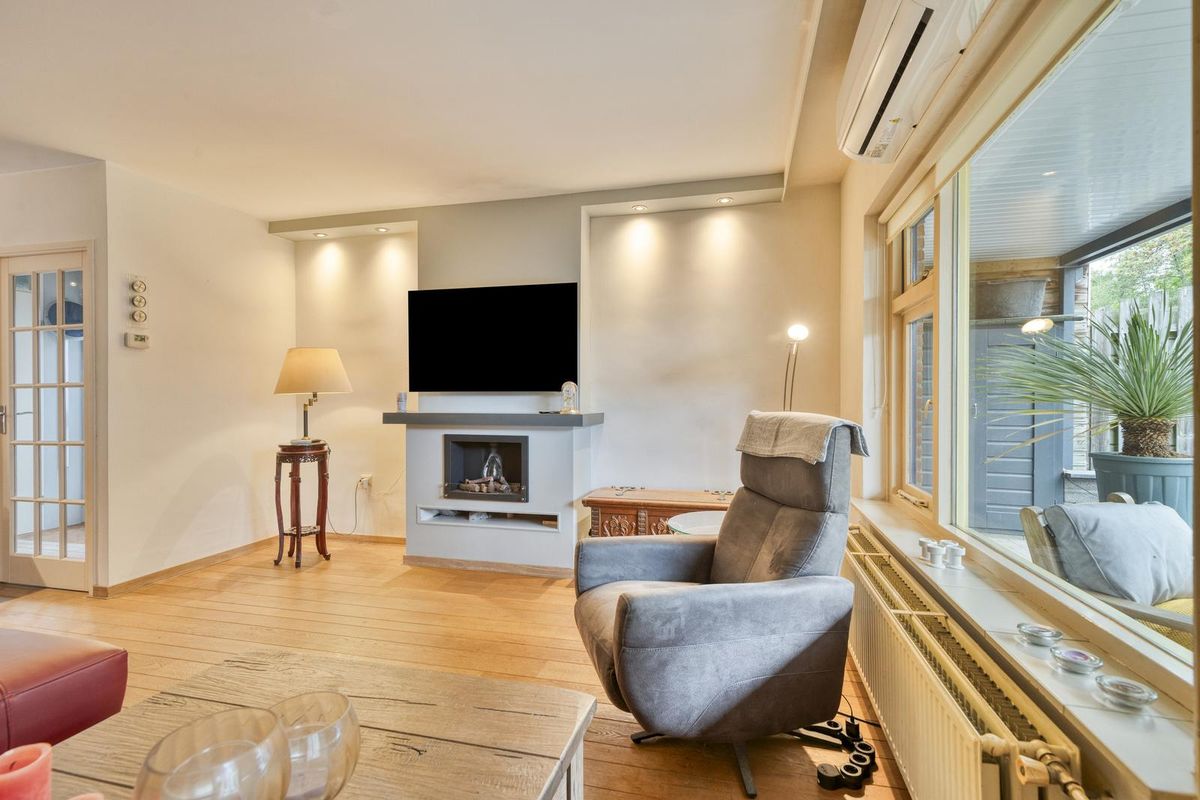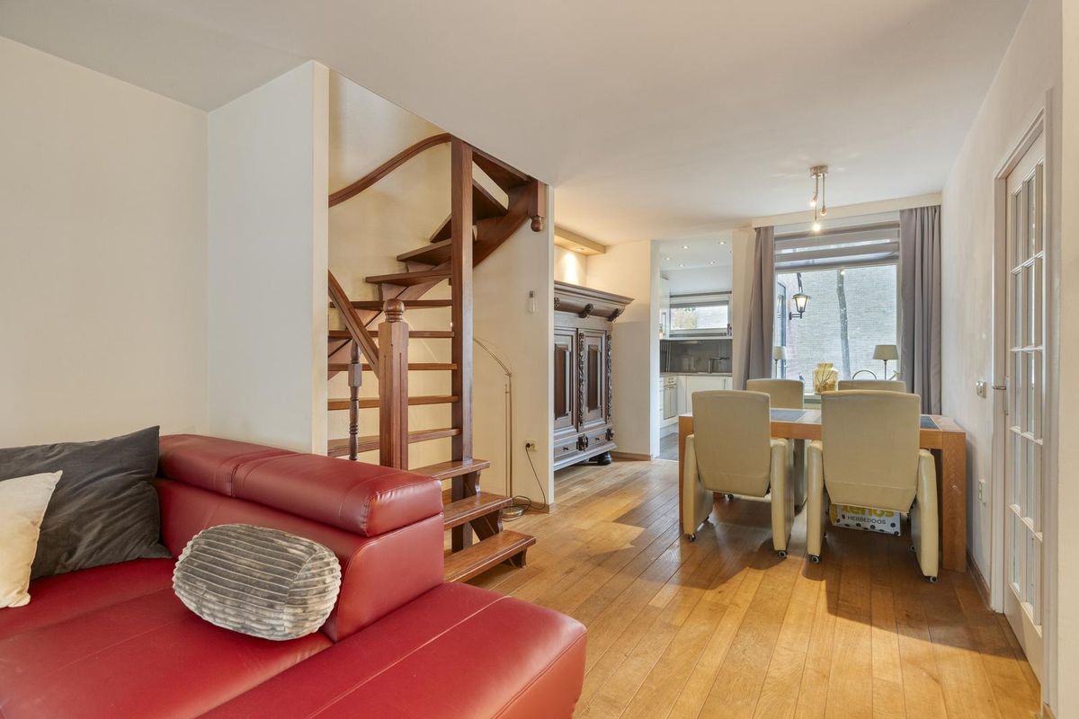 De woonkamer is een sfeervolle ruimte met een knusse sfeerhaard en uitzicht op de tuin. Aan de achterzijde is volop plek voor een gezellige zithoek, terwijl in het midden van de living ruimte is voor een 4-persoonseettafel. De trap in de woonkamer zorgt voor een speels effect en maakt het geheel open en licht.