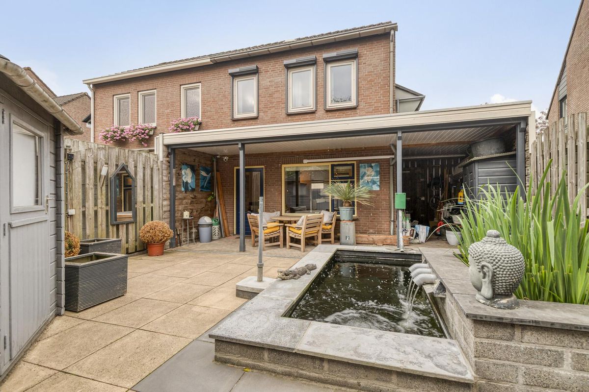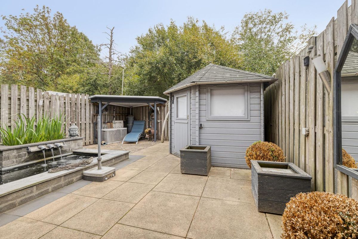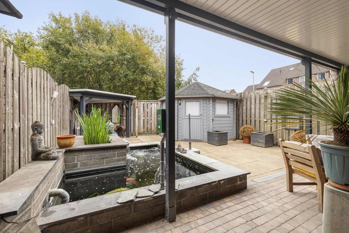 De achtertuin is volledig betegeld en daarmee onderhoudsvriendelijk. Achterin bevindt zich een houten berging met kleine overkapping en een sfeervolle vijver. Direct aan de woning grenst een ruime overkapping, perfect om een loungehoek te creëren en tot laat van lange zomeravonden te genieten. Uiteraard is er een achterom aanwezig.