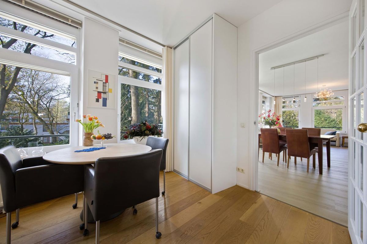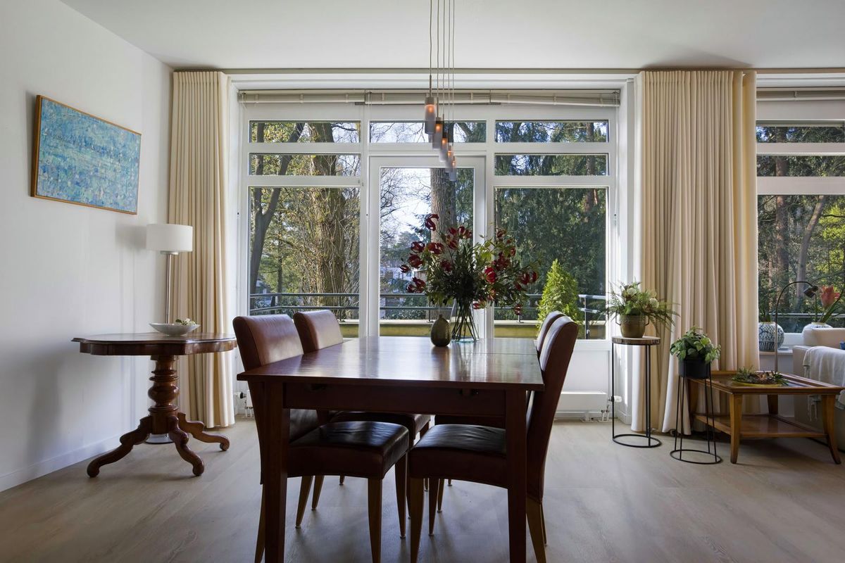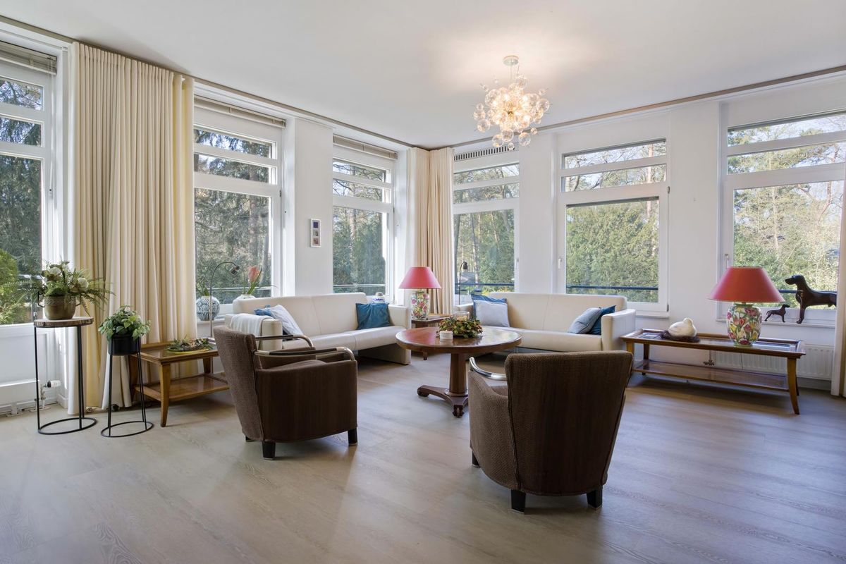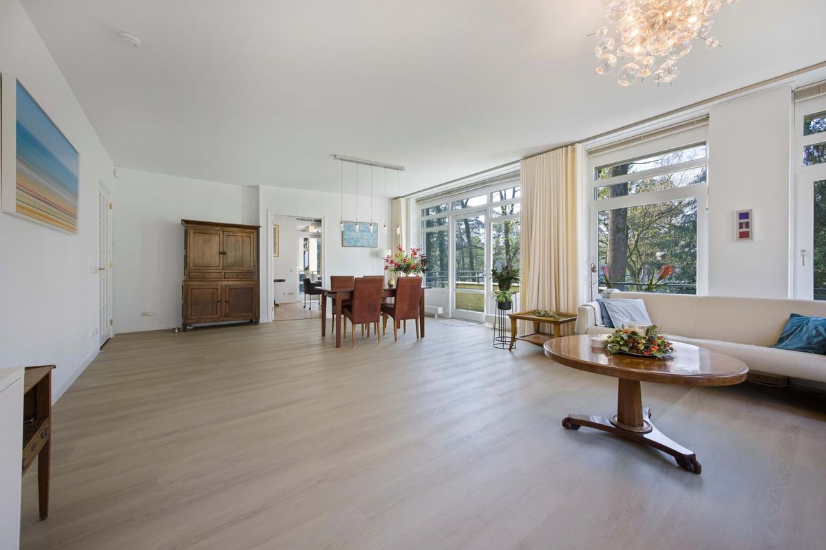 Deze bijzonder fraaie woonkamer kijkt prachtig uit in het groen dankzij de vele raampartijen. Het appartement beschikt over meerdere terrassen, waarvan de eerste aan de voorzijde van het appartement is gelegen.