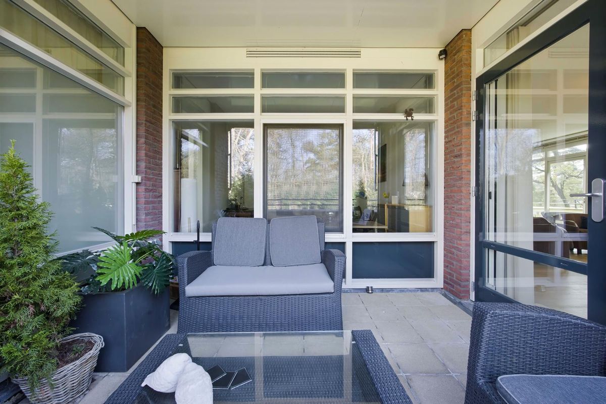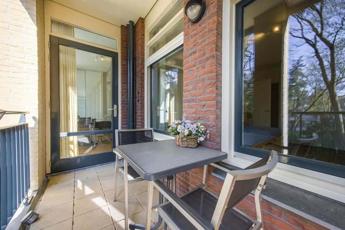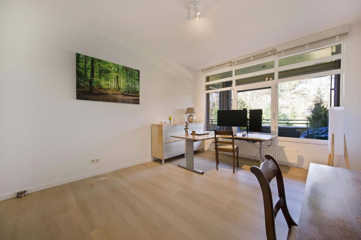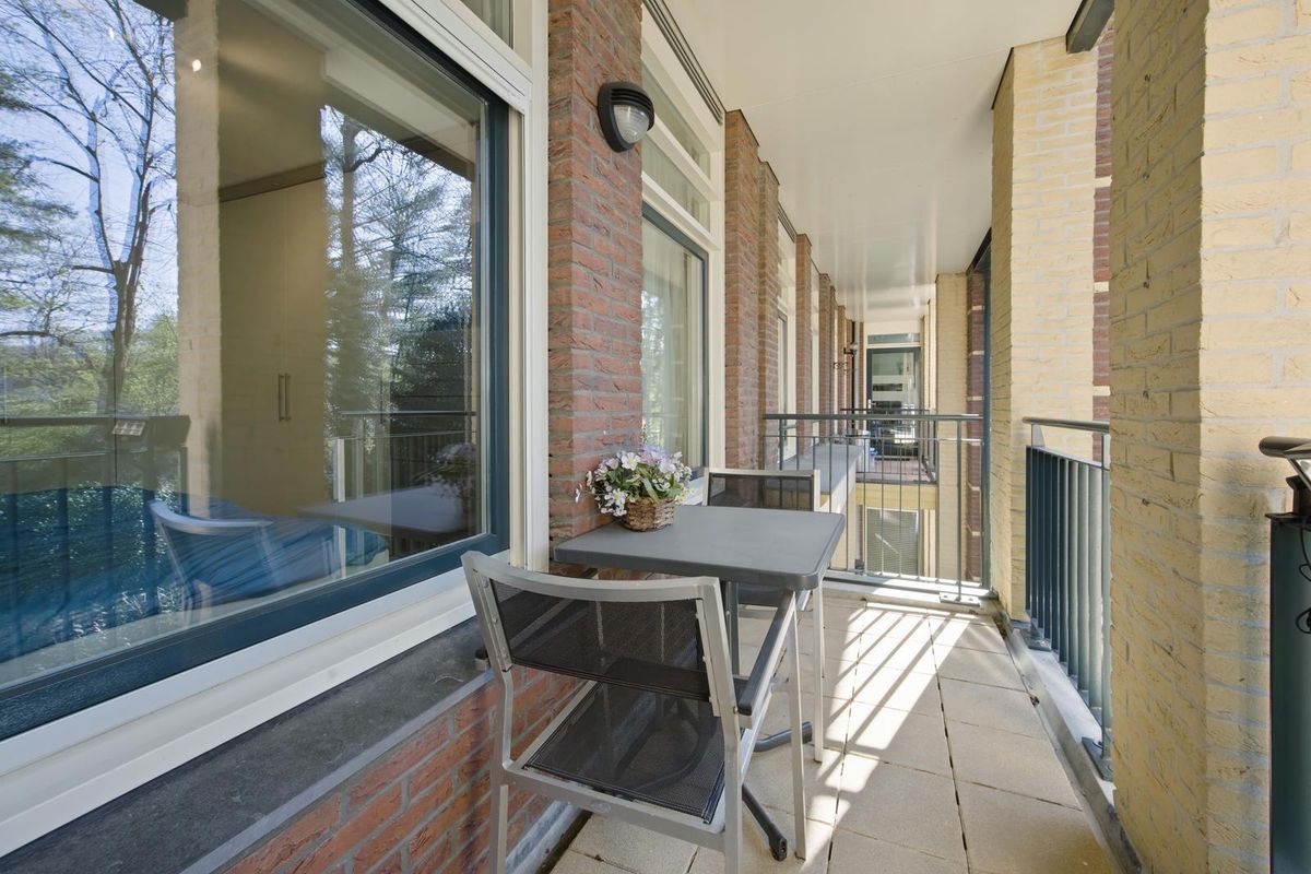 Deze bijzonder fraaie woonkamer kijkt prachtig uit in het groen dankzij de vele raampartijen. Het appartement beschikt over meerdere terrassen, waarvan de eerste aan de voorzijde van het appartement is gelegen.