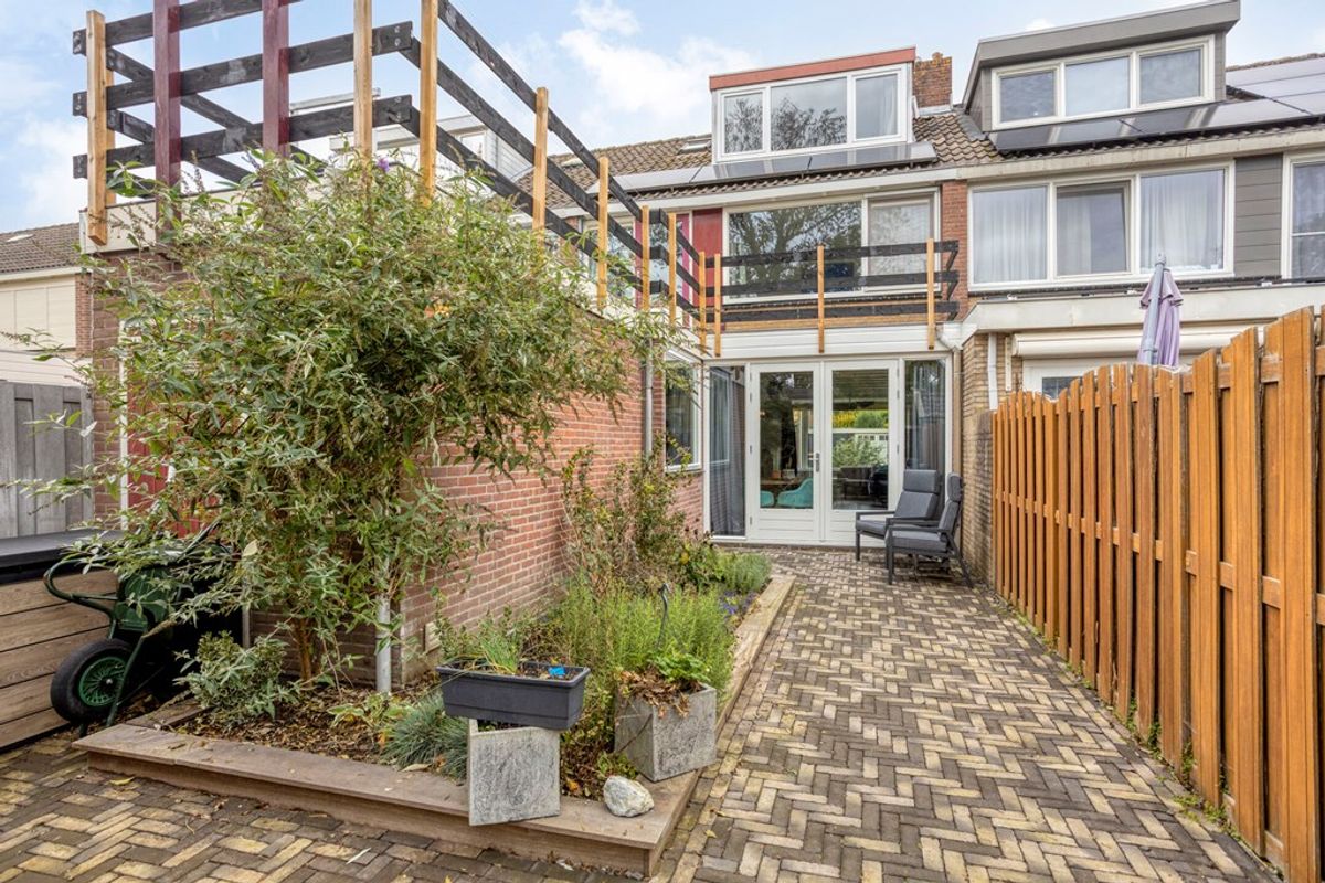 De heerlijke achtertuin met vrij uitzicht (zonder achterburen) op het zuidoosten is zeer netjes bestraat met een kleurvaste gebakken klinker en op de erfafscheidingen staat een stevige hardhouten schutting. Langs de rand van de berging een lange smalle border voor natuurlijk groen. De gezellige kapschuur met een keramische tegel op de grond (2022) staat garant voor menig gezellig uurtje buiten. De poortdeur is verbreed, waardoor de tuin ook gemakkelijk toegankelijk is voor bv een motor of scooter. Als u omhoog kijkt dan ziet u een vernieuwde (2025) balustrade langs het dakterras. Het schilderwerk buiten is in 2024 en 2025 uitgevoerd.