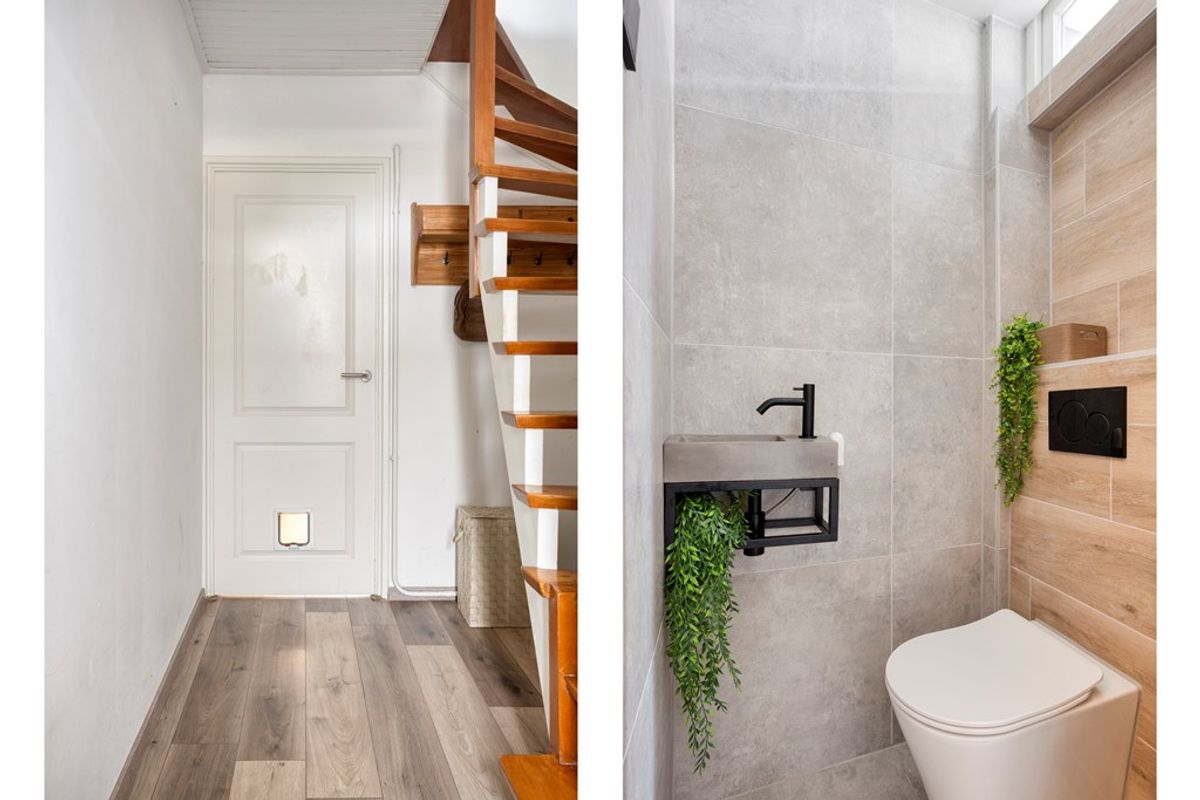 Via de nieuw bestrate voortuin (2024) loopt u de ruime entree binnen met deuren naar de moderne toiletruimte (2024): met taupe wand- en vloertegels, sfeervolle eikenprint (lange) tegel op de achterwand, fonteintje en wandcloset), meterkast (2020) en woonkamer. Er is in de hoek onder de trap meer dan voldoende ruimte voor uw jassen en schoenen. De houten voordeur (2024) is geïsoleerd en heeft een driepuntsluiting.