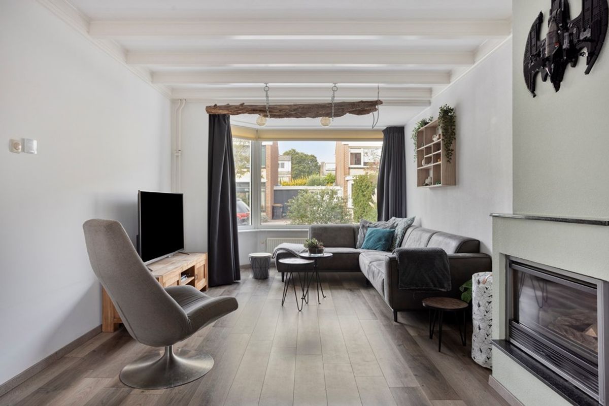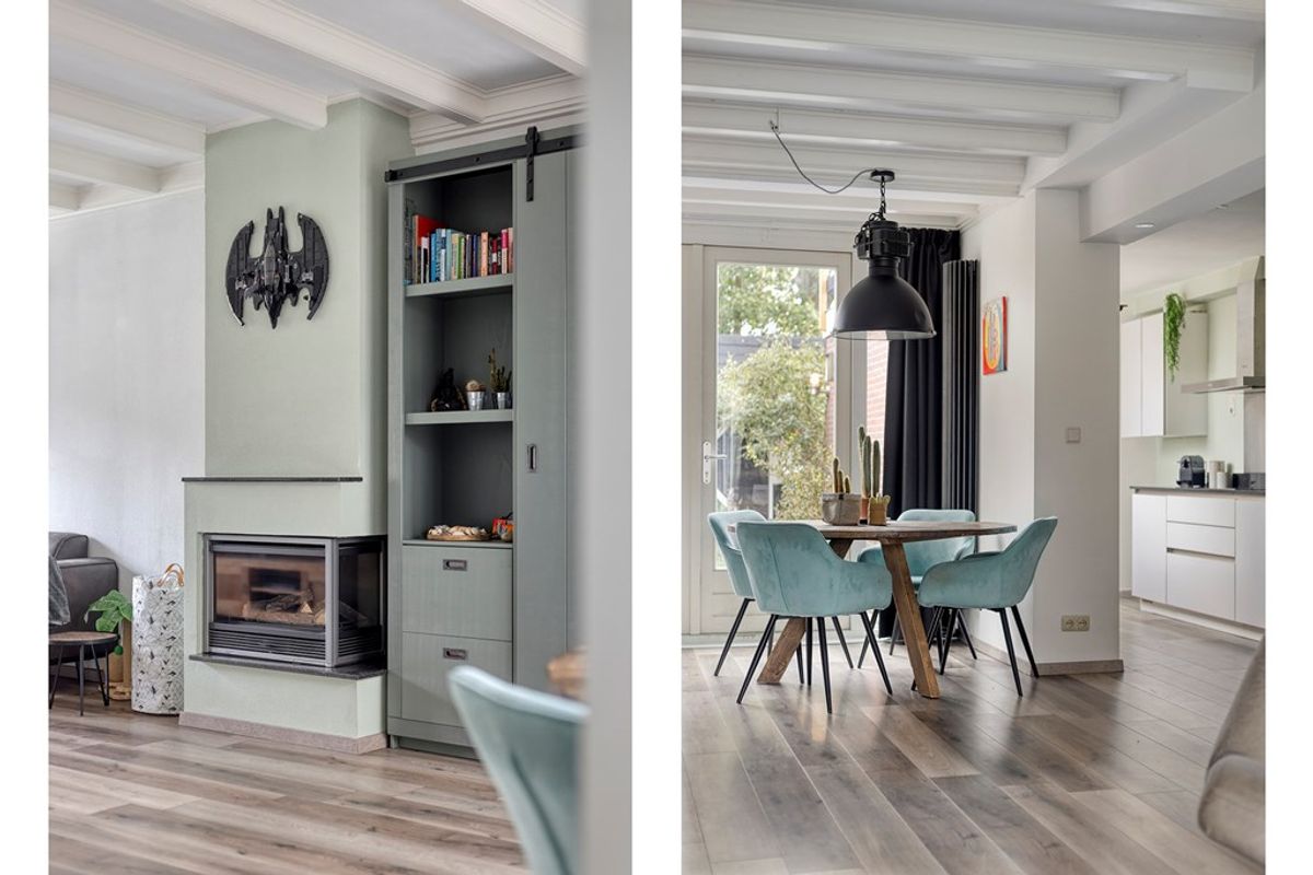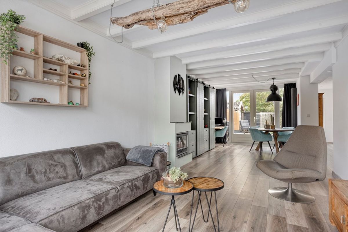Mooie verrassing hoor! Geweldige living! Aan de voorzijde, bij/in de erker, kunt u een gezellige zit inrichten. Door de erker heeft u veel natuurlijke lichtinval. Op het middenstuk of aan de achterzijde van de living kunt u een grote eettafel kwijt. Er is nu zelfs tevens een werkplek ingericht. Ruimte genoeg! De openslaande deuren (2021) maken het geheel gezellig, ruim en licht. De laminaatvloer ligt er netjes bij, de wanden zijn grotendeels gestuukt en het houten balkenplafond geeft de woonkamer een nostalgisch sfeertje. Halverwege de woonkamer is een gashaard (onderhoud is nodig), die bijdraagt aan gezellige warme winteravonden.