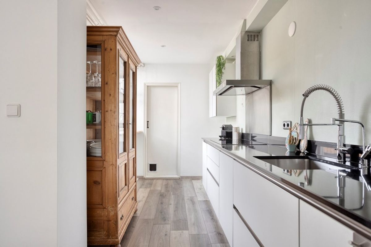 Door de uitbouw is de keuken daarin gedeeltelijk geplaatst. Mooie moderne rechte opstelling van ongeveer vijf meter lang! Greeploze witte kasten en laden en een zwart composieten werkblad met als eyecatcher een luxe spoelkraan. Alle gewenste inbouwapparatuur is aanwezig: brede inductiekookplaat (86 cm/2020), afzuigkap, Quooker kraan, combi oven-magnetron (2024), vaatwasser en koelkast. Aan de andere zijde is onder het brede raam een sfeervolle houten vensterbank gemonteerd voor uw leuke keukenspullen of mooie planten!