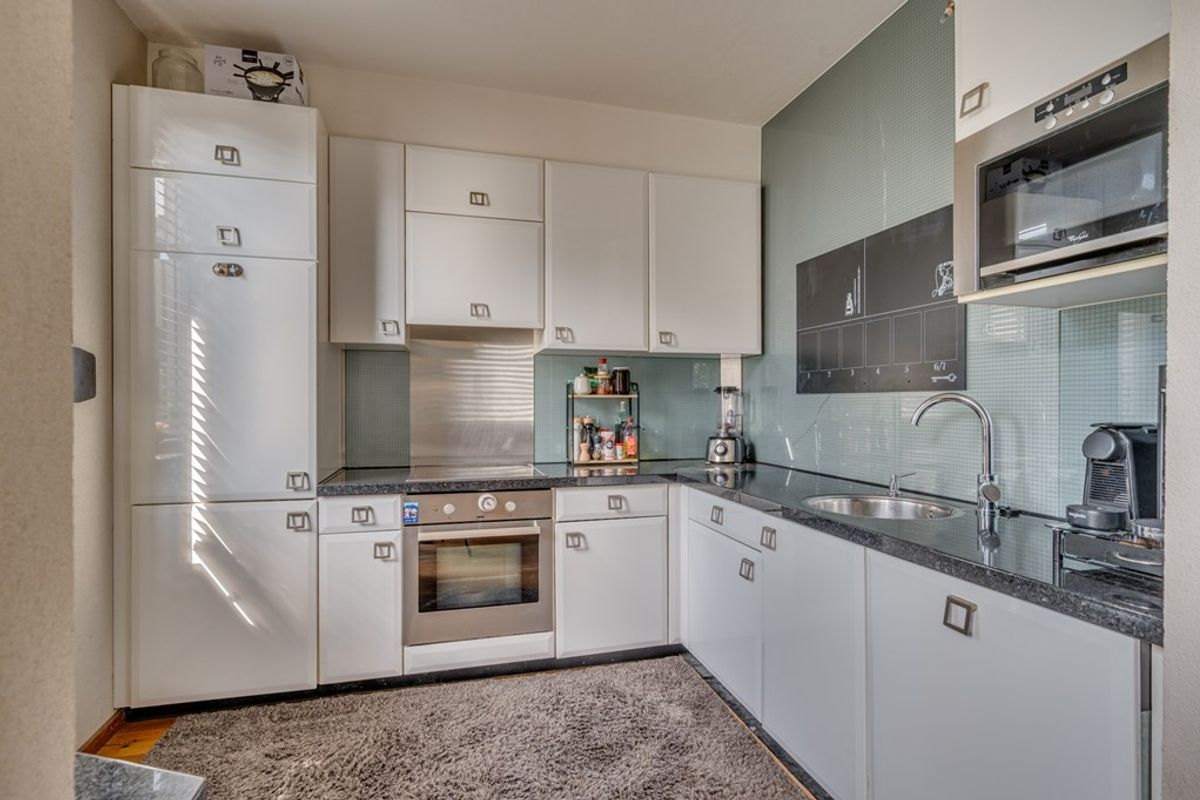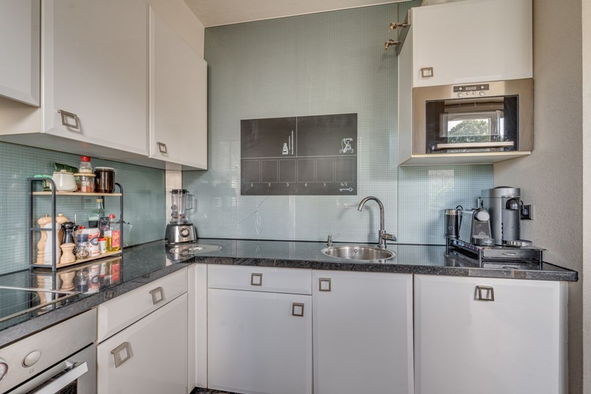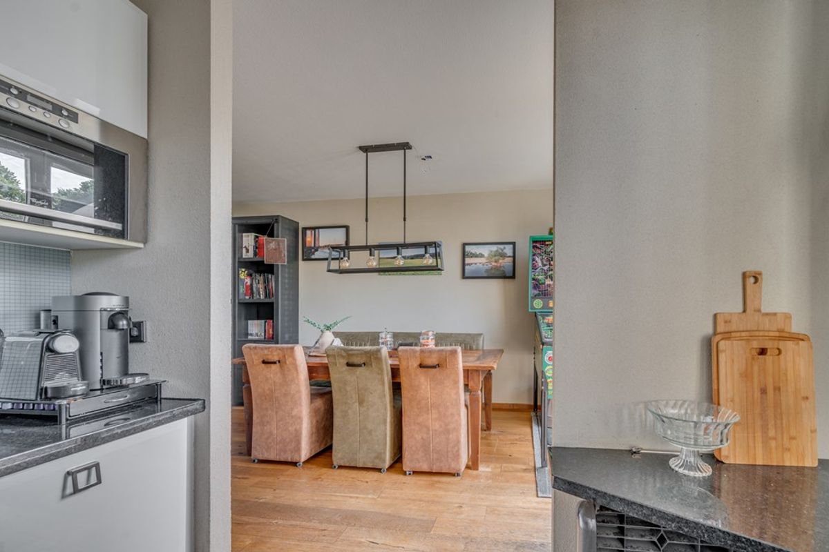 Via de entree bereik je de lichte woonkamer met eiken vloer en harmonicadeur naar het terras. De halfopen keuken in witte uitvoering is voorzien van diverse inbouwapparatuur.
