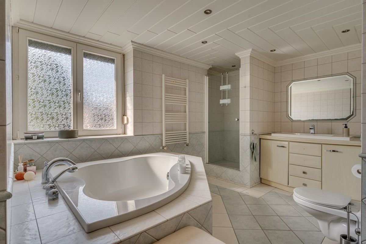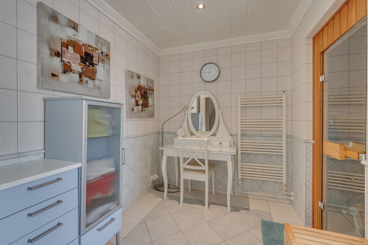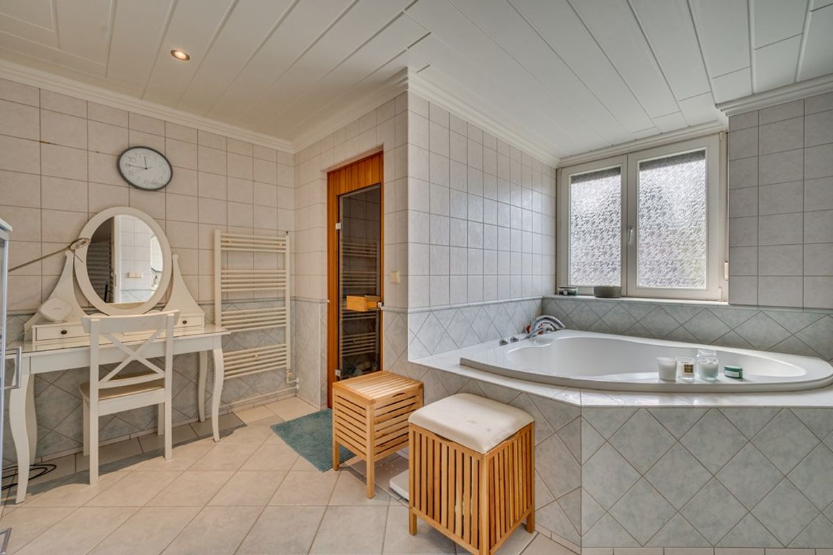 - Zeer ruime badkamer met hoekbad, douche, toilet, wastafelmeubel en een sauna.