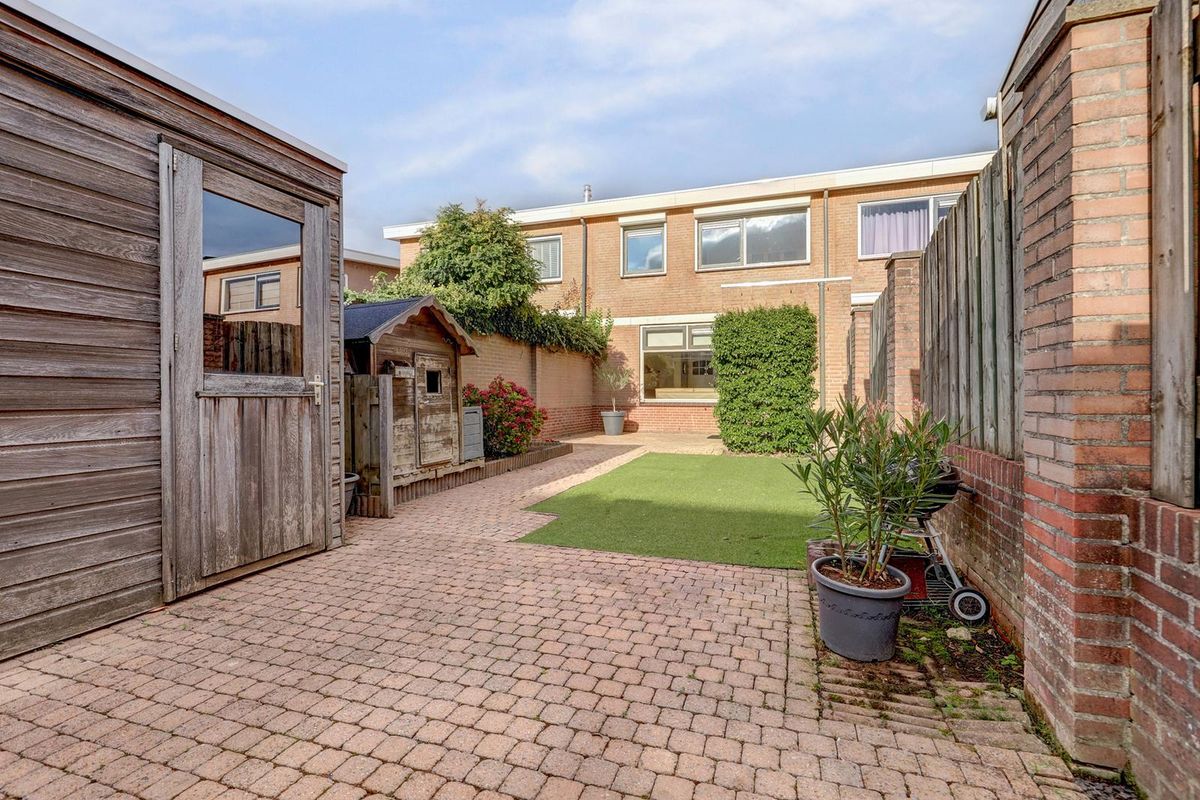 De voortuin is verzorgd aangelegd met sierbestrating, borders met fraaie hortensia’s, sierheesters en een sierboom. De achtertuin biedt volop privacy en is fraai ingericht met een ruim terras, een gedeelte met kunstgras, een verhoogde border met vaste planten en een vrijstaande houten berging. De onderhoudsvriendelijke tuin ligt op het zuiden en biedt de hele dag door fijne zitplekken in zon en schaduw.