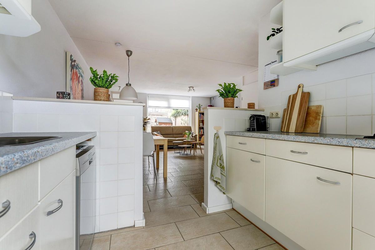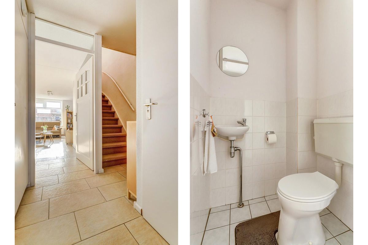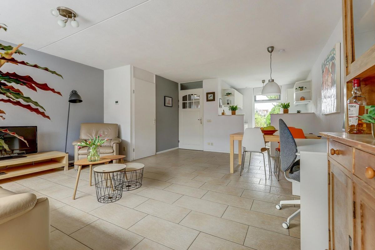 Entree, hal met meterkast en toilet met fontein. De ruime woon-/eetkamer heeft een prettige indeling met een trapkast en een grote raampartij waardoor er veel daglicht binnenkomt. De half open keuken is voorzien van diverse inbouwapparatuur zoals een gaskookplaat, koelkast en combimagnetron, de vaatwasser is losstaand. Aansluitend aan de brede woonkamer bevindt zich de berging/bijkeuken met toegang tot de achtertuin. De vloeren van de begane grond zijn voorzien van plavuizen.