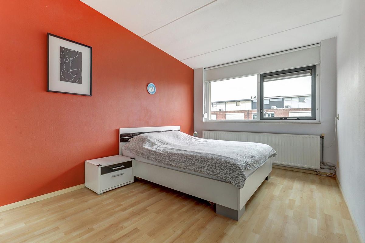 Overloop met toegang tot de verschillende vertrekken. Aan de voorzijde bevindt zich de eerste slaapkamer met een hoog plafond en een handige vliering voor extra bergruimte. Ernaast ligt de ruime badkamer met douchecabine, tweede toilet, wastafel en een aansluiting voor de wasmachine. De wasmachine kan ook worden geplaatst in de cv-ruimte/kast op de overloop. Aan de achterzijde zijn nog twee slaapkamers, waarvan één momenteel in gebruik is als kantoor. Alle slaapkamers zijn voorzien van rolluiken. Op de vloeren van de slaapkamers en de overloop ligt laminaat.