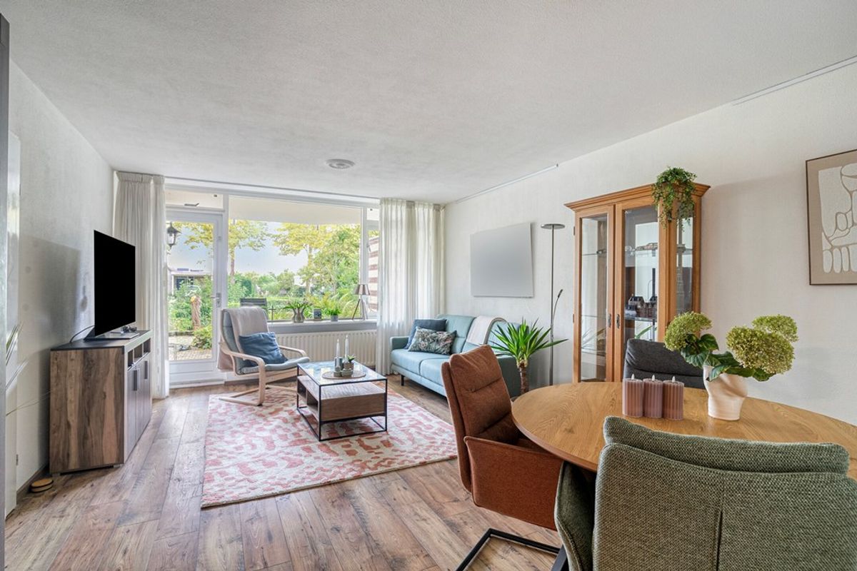 Bij binnenkomst valt direct de prettige lichtinval op. De ruime woonkamer heeft grote raampartijen en een tuindeur naar het terras, waardoor binnen en buiten naadloos in elkaar overlopen. Vanuit uw zithoek kijkt u uit op het groene plantsoen, wat een gevoel van rust en privacy geeft. De eethoek sluit aan op de halfopen keuken, die is ingericht met crèmekleurige fronten, een donker werkblad en diverse inbouwapparatuur zoals een gaskookplaat, oven, afzuigkap en koelkast.