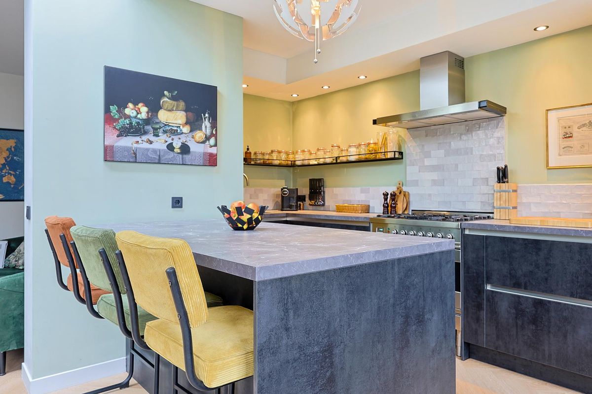 Begane grond: Entree met hal, trapkast en trapopgang. Direct naast de voordeur bevindt zich een kantoorruimte. De woonkamer met open wand loopt door naar de uitbouw, waar een eetkamer en royale luxe woonkeuken zijn gerealiseerd. De keuken is geplaatst in een hoekopstelling met eiland, bar en diverse inbouwapparatuur. Vanuit de eetkamer bieden openslaande deuren toegang tot het terras en de achtertuin op het zuidoosten.