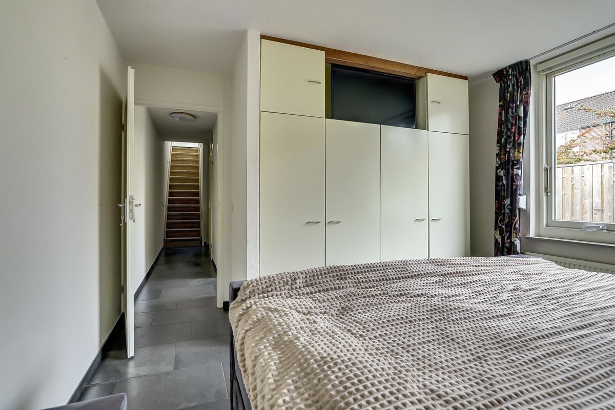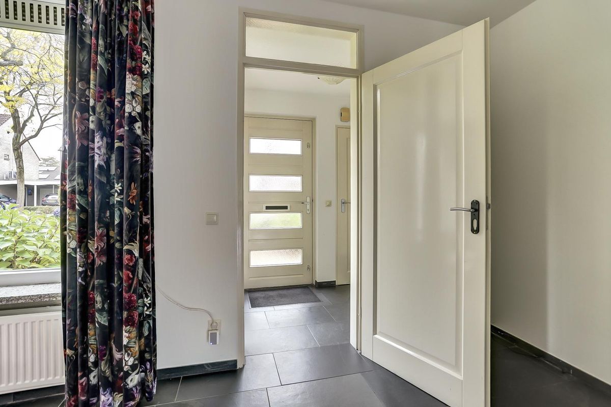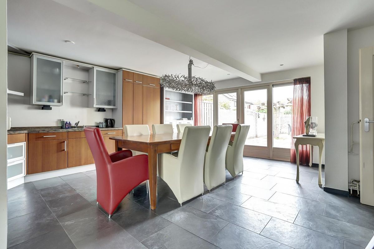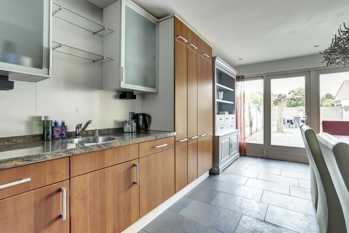 Bij binnenkomst wordt u ontvangen in de lichte hal met toegang tot de woonkamer en inpandige garage welke nu in gebruik is als kantoor. De L-vormige woonkamer ademt warmte dankzij de fraaie leistenen vloer en de grote ramen die zorgen voor een natuurlijke lichtinval. Aan de achterzijde bevindt zich de keuken, die uitnodigt tot gezellig tafelen. Deze is uitgevoerd in een praktische L-opstelling met diverse inbouwapparatuur. Vanuit de keuken stapt u zo de tuin in — ideaal voor een kop koffie in de ochtendzon.